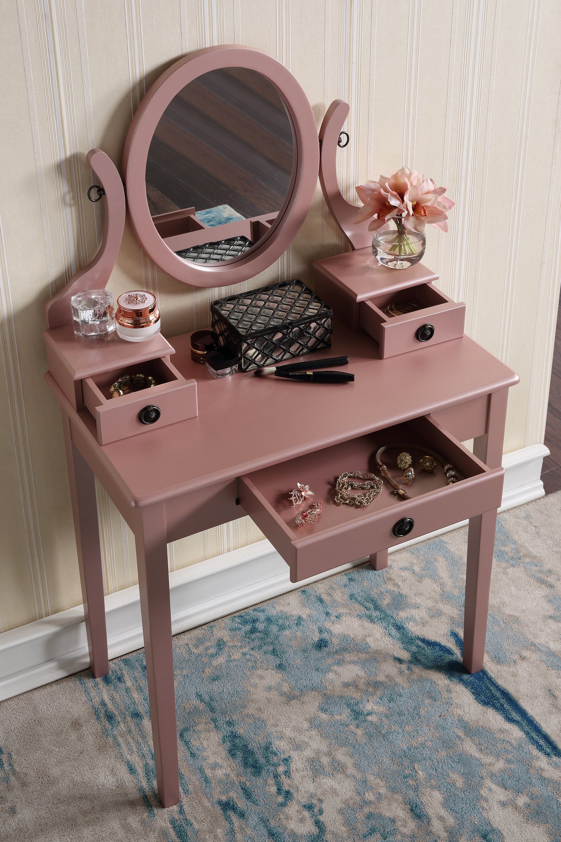 Roundhill Furniture Moniya Wood Makeup Vanity Table and Stool Set, Rose Gold