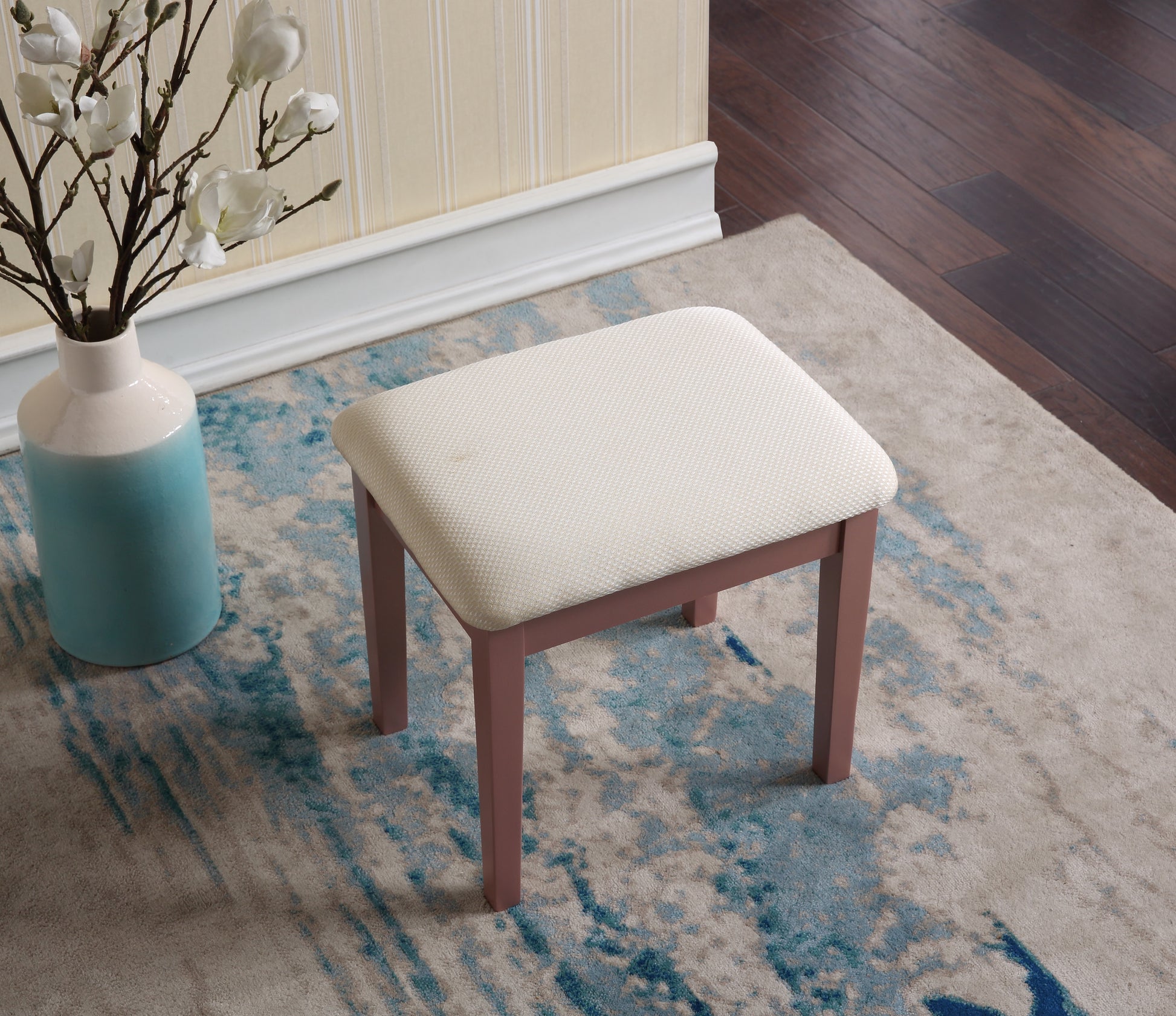 This stylish contemporary vanity table's with swivel adjustable mirror and 3 storage drawers. It's great for storing your jewelry and a smooth tabletop provides space for cosmetics and beauty supplies. It also includes a matching wooden stool with a padded upholstered seat. This is sure to accent your bedroom.