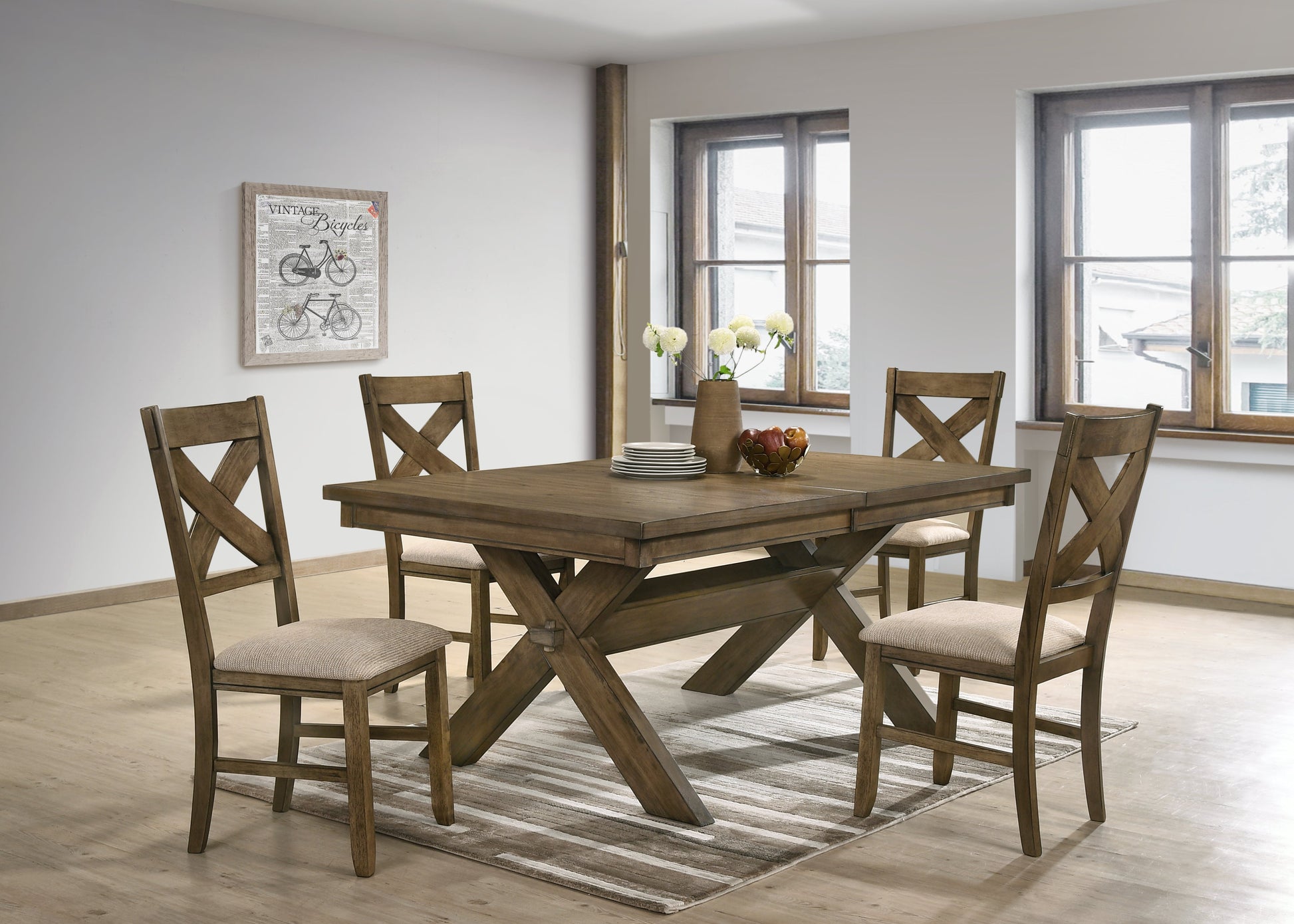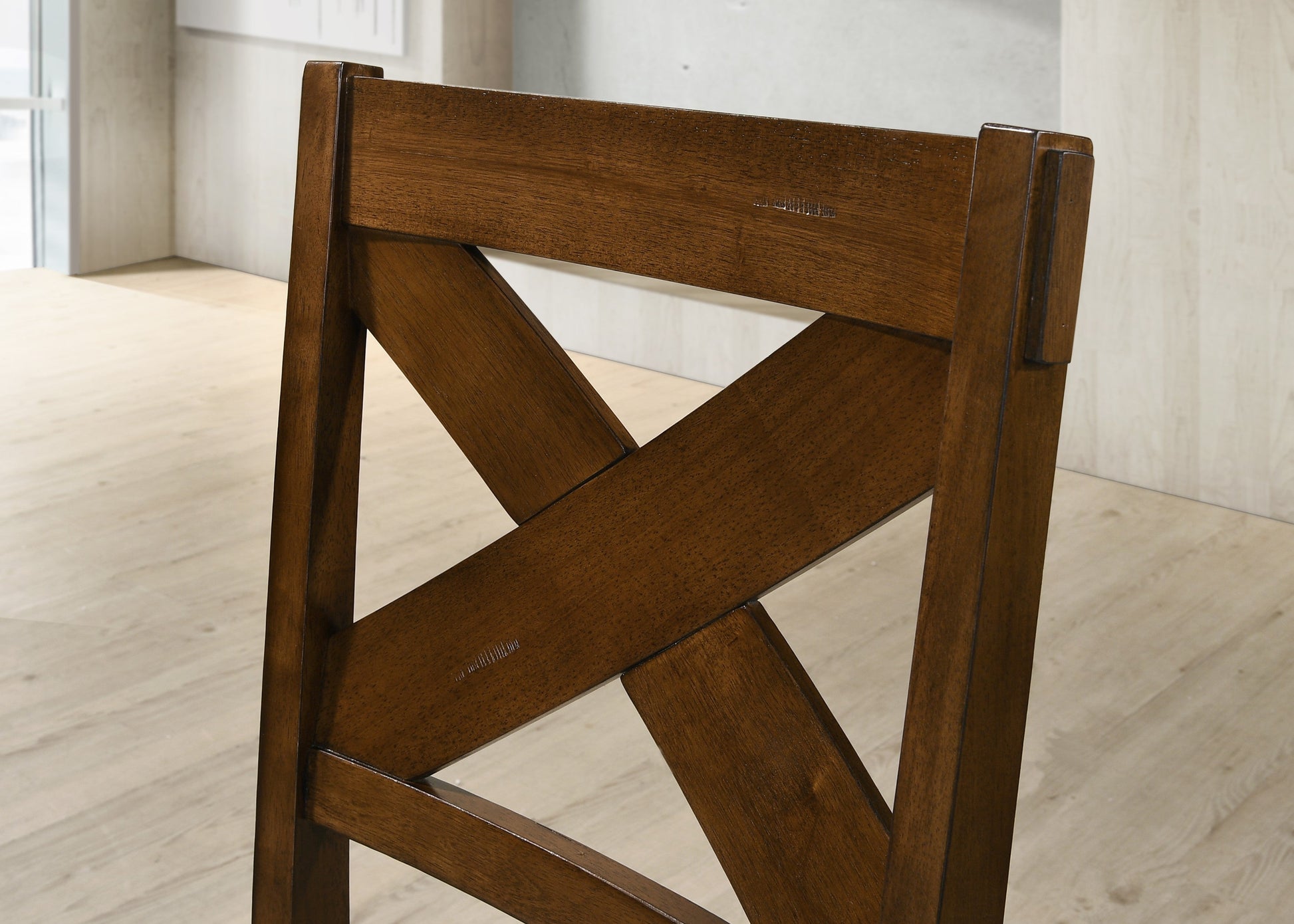 Give your dining area a warm, welcoming update with the Roundhill Furniture Raven Wooden Dining Table Set. Each piece has block legs and a wooden frame finished in an enchanting glazed pine brown. The rectangular table and bench both have trestle bases with X-shaped legs. Each chair's back has an open cross-back design and foam padding in the seat. Beige fabric upholsters the seat. Chair only.