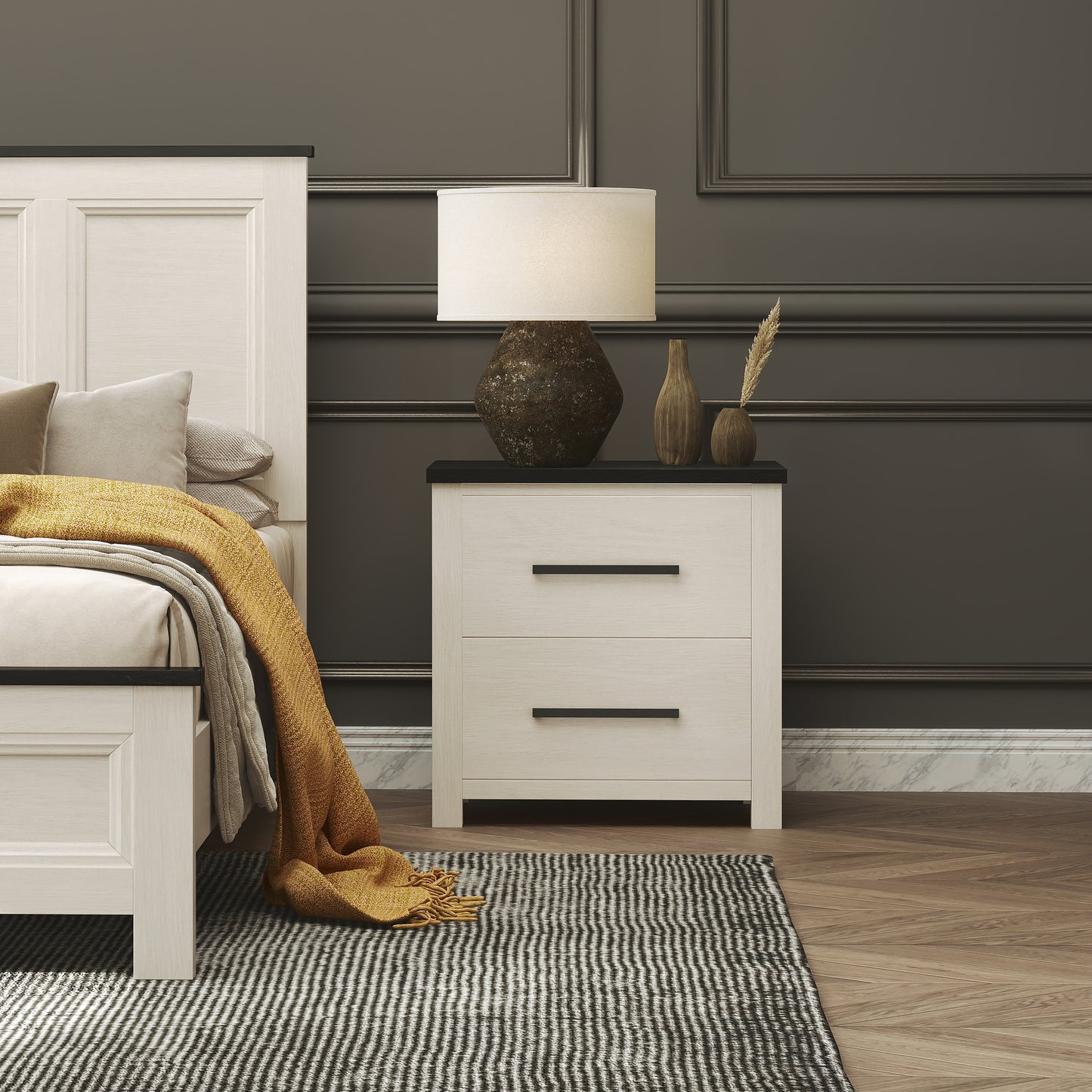 The Realynn 2-Drawer Nightstand combines timeless design and everyday functionality, making it the perfect bedside companion. Its off-white finish with a black top creates a chic two-tone look that complements any décor. Featuring two spacious drawers, it provides ample storage for books, electronics, or other essentials, helping you keep your space neat and organized. Matte black metal handles add a sleek, modern touch, while the high-quality manufactured wood ensures durability. Compact yet practical, this nightstand brings elegance and convenience to bedrooms or guest rooms.