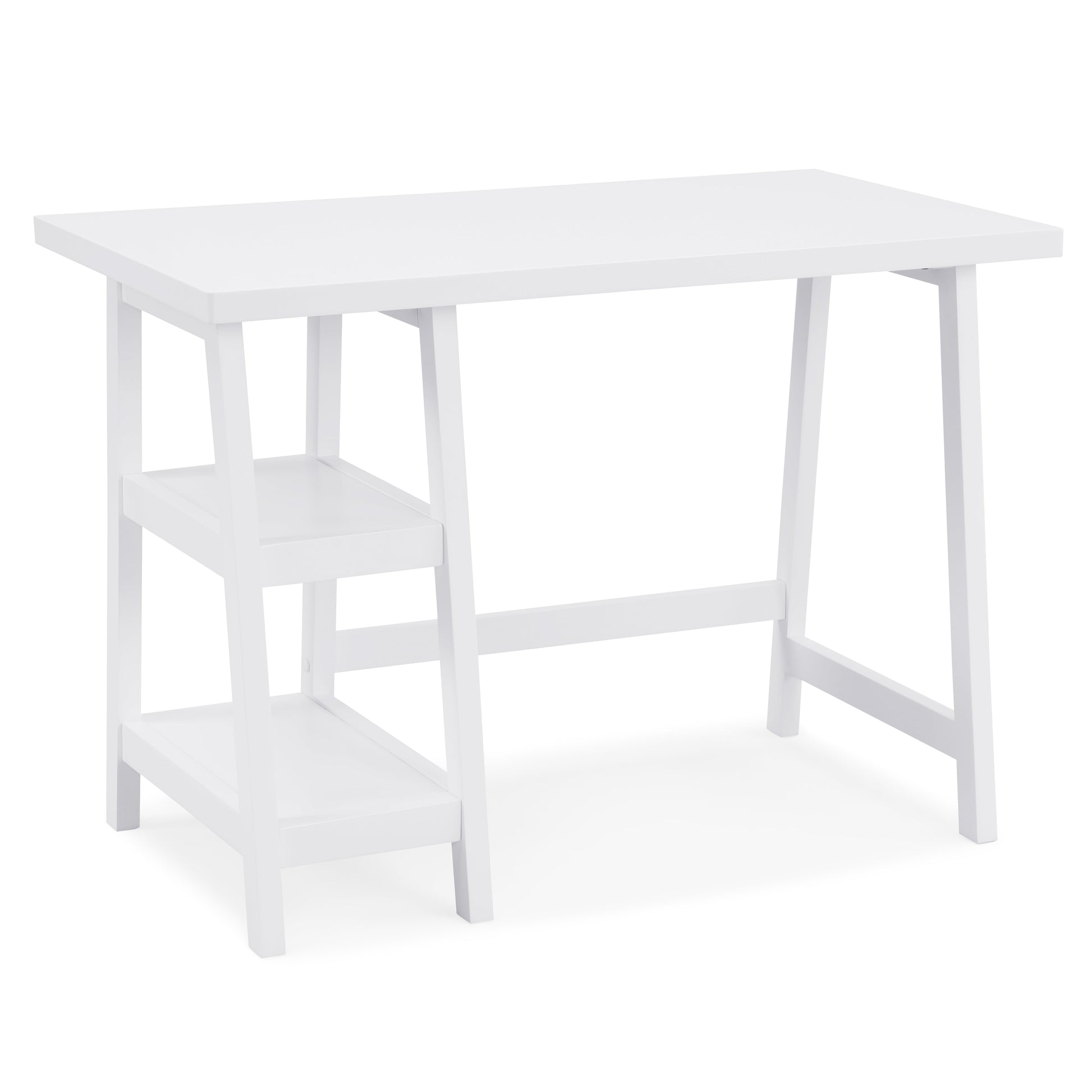 Perfect for smaller spaces, the Redina Contemporary Wood Writing Desk features a simple contemporary style. Made from wood solids and veneers, this desk comes in your choice of available finishes. The pair of open shelves provide ample storage, and the large top makes for a great workspace.
