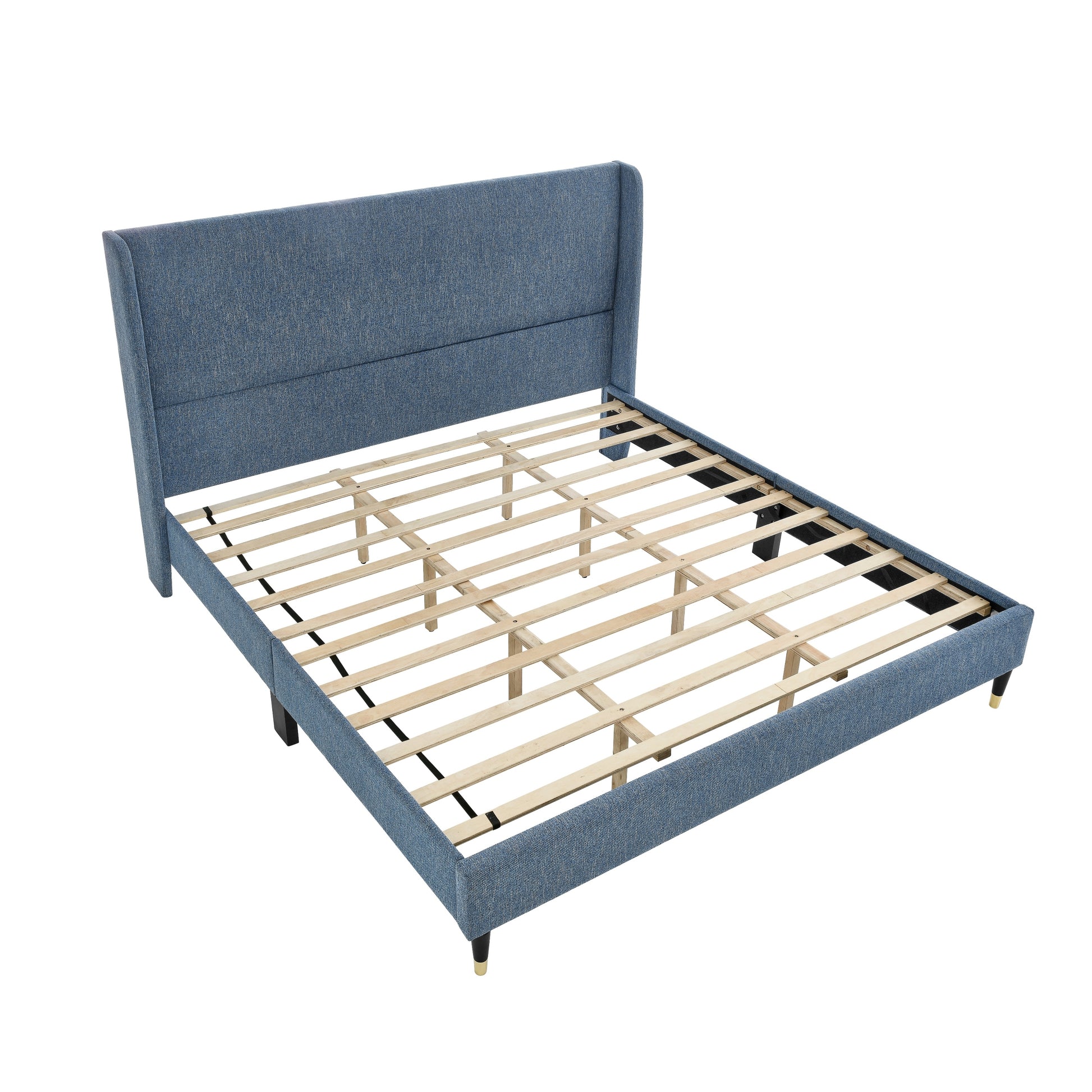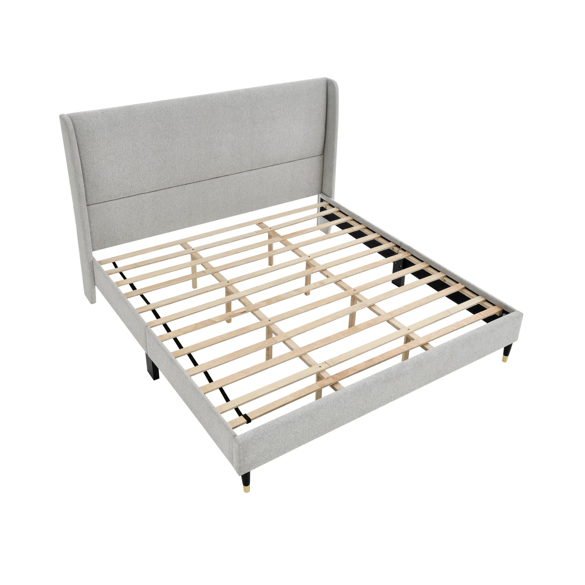 The Roundhill Furniture Rozitta Upholstered Wingback Platform Bed combines comfort and style in a luxurious way. With its well-padded headboard and side panels, it creates a cozy and cloud-like feel. The wingback headboard design adds elegance, while the cone-like legs in a black-gold finish give a modern touch. This bed is built to last, with a sturdy plywood frame and durable slats for extra support. No box spring is required for this low-profile, minimalist platform bed.