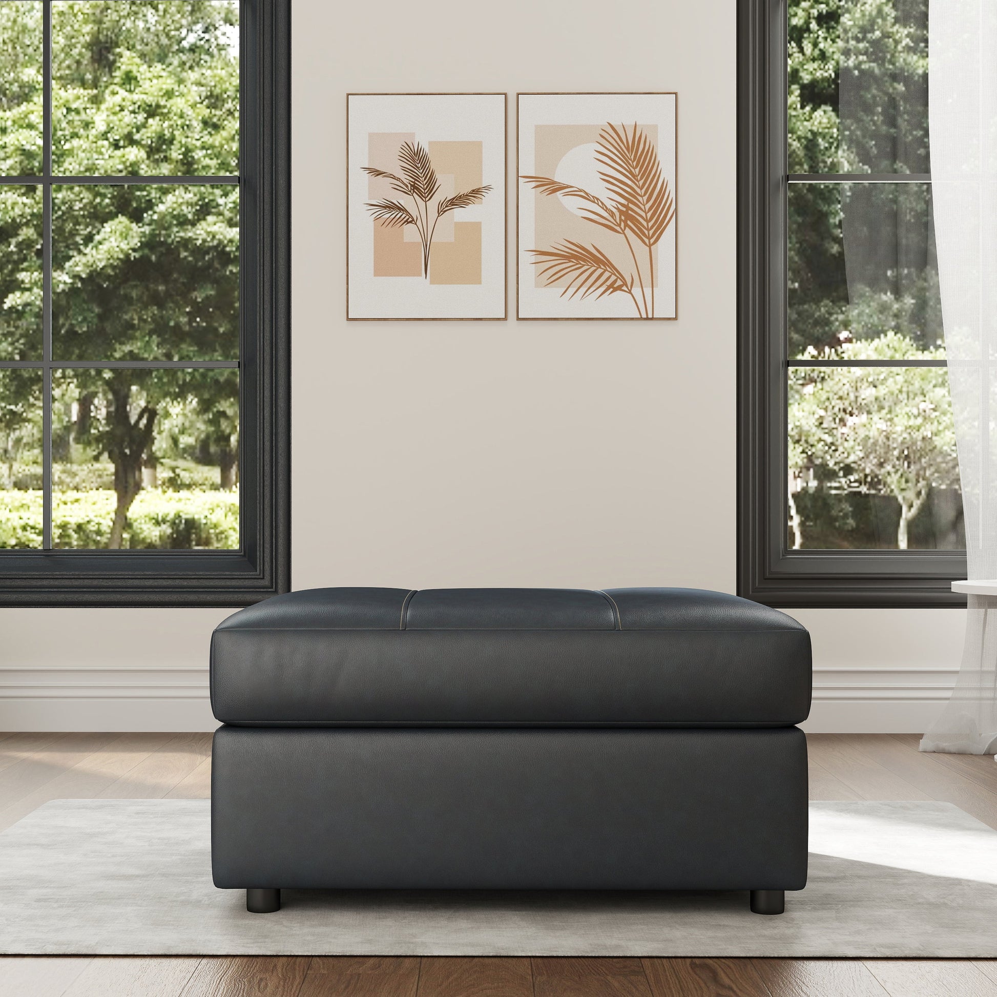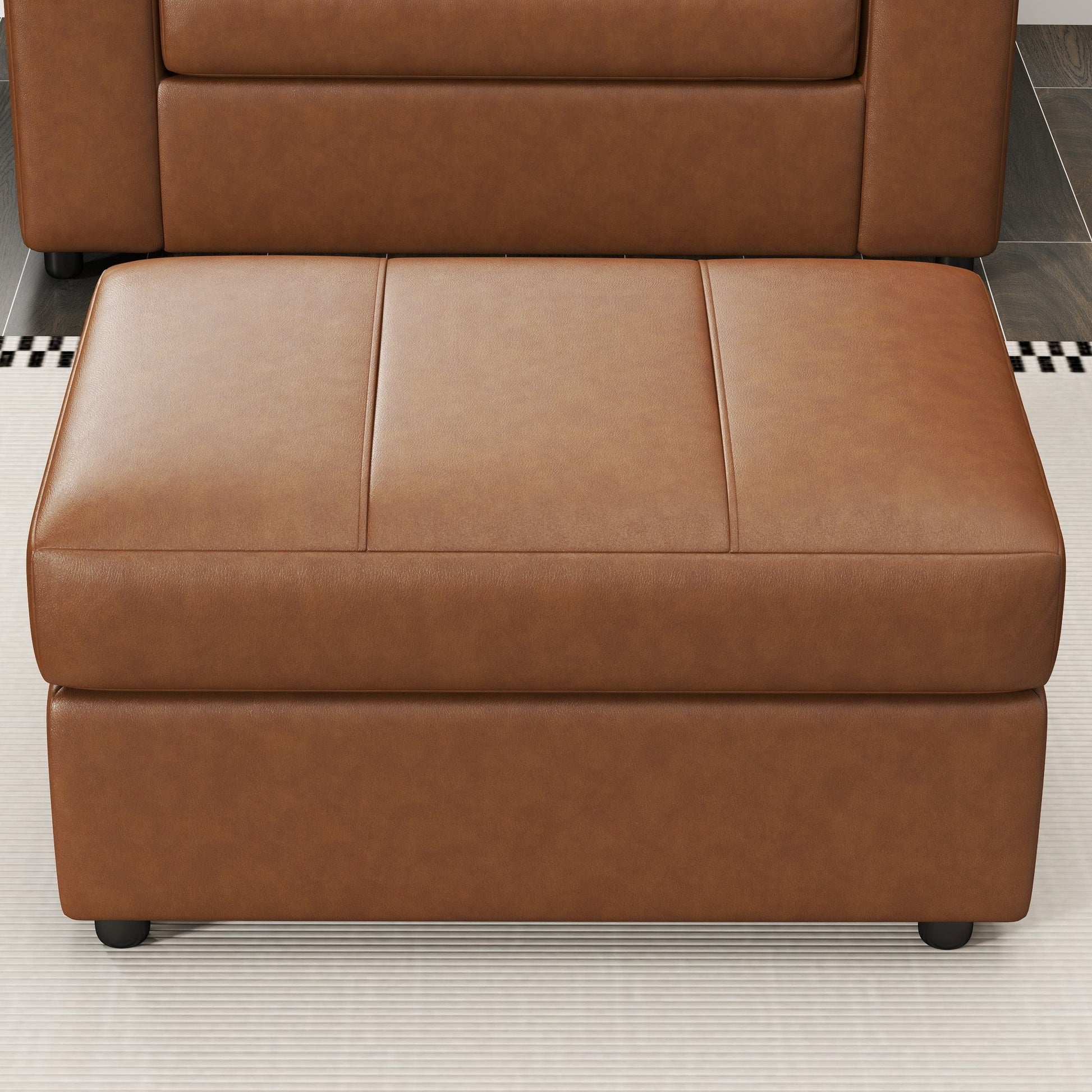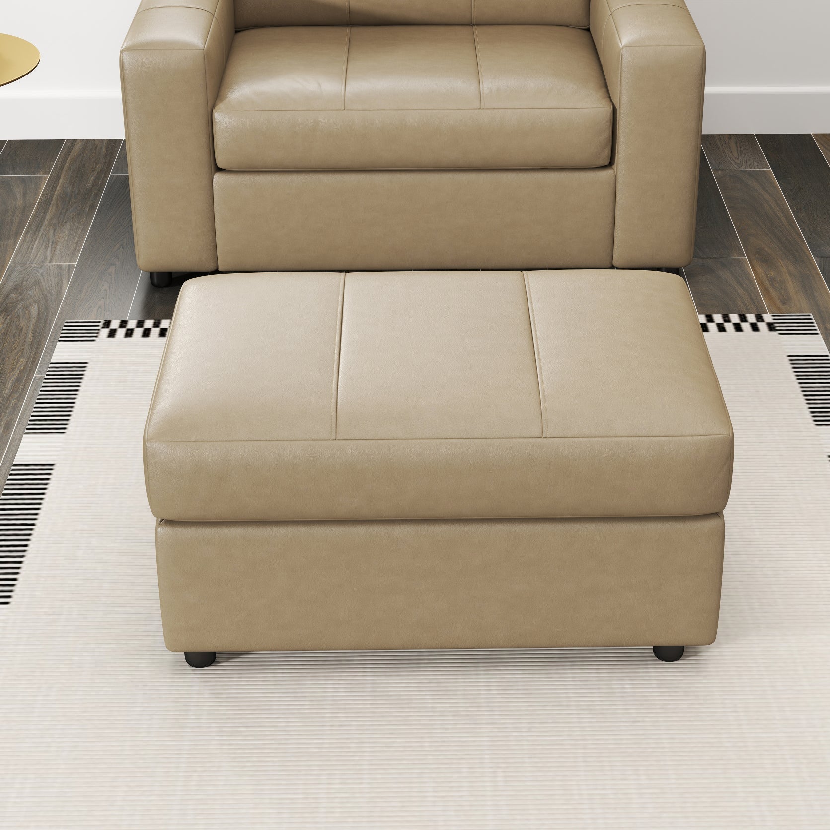 - [BUILT TO LAST]:??This ottoman is meticulously crafted with quality materials and expert attention to detail. It features leather upholstery and high-resiliency foam cushions. The exposed feet with faux wood finish add warmth and contrast. This ottoman is built for durability and stability that withstand the test of time.