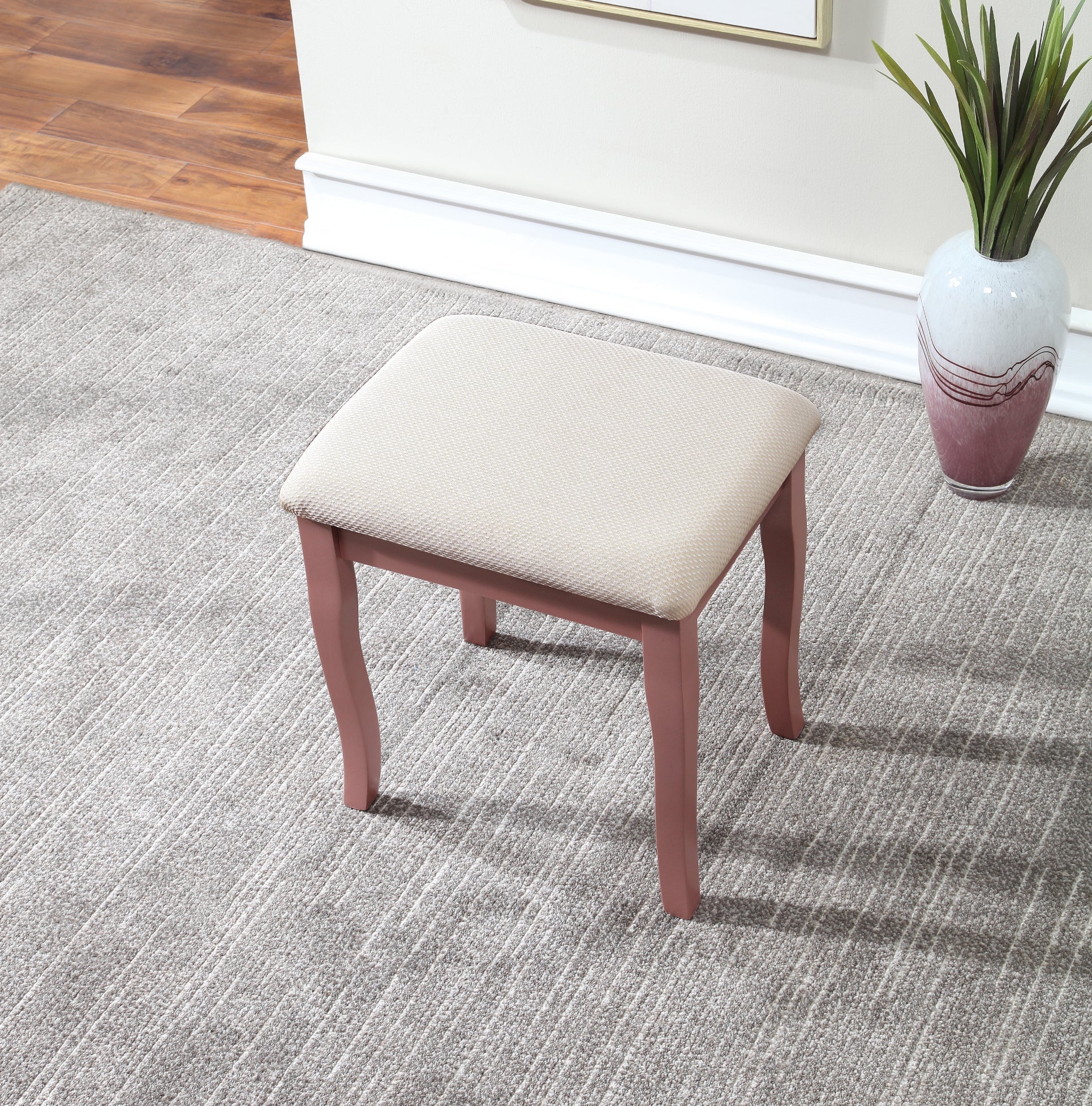 - Set includes a vanity, a 3-panel beveled mirror, and a thickly upholstered rectangular bench for comfort and style.