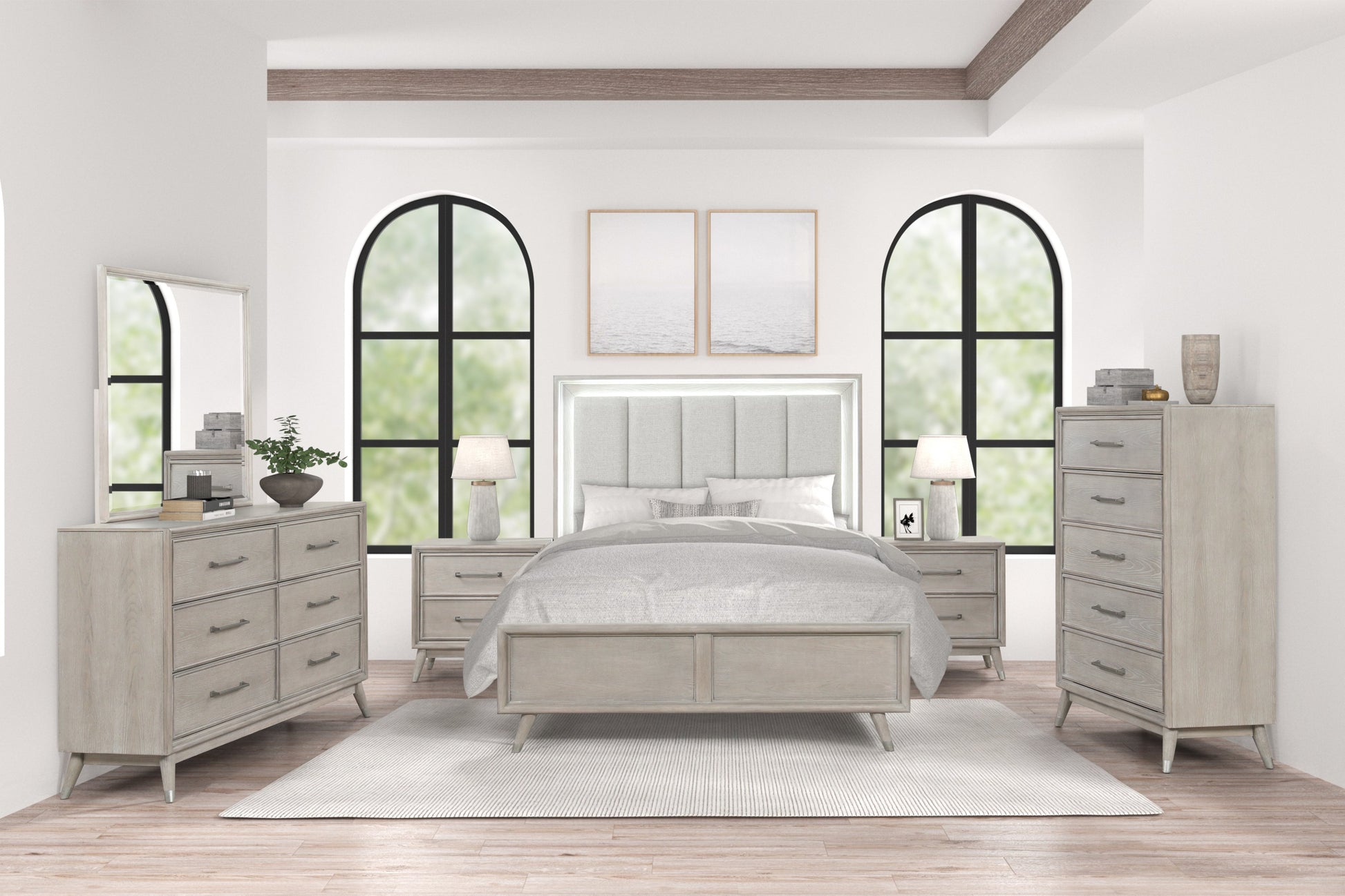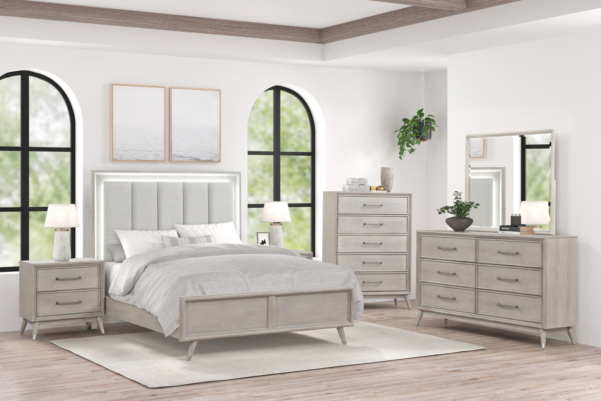 Meet the Seluna Bedroom Collection with LED Lighting Headboard by Roundhill Furniture. This set includes a panel Bed, Dresser, Mirror, Nightstand, and Chest. Elevate your bedroom with this exquisite set that combines functionality and style. Featuring an upholstered headboard wrapped in breathable fabric, it offers cloud-like comfort and understated elegance, with built-in lighting that illuminates your room with a soft, warm glow.