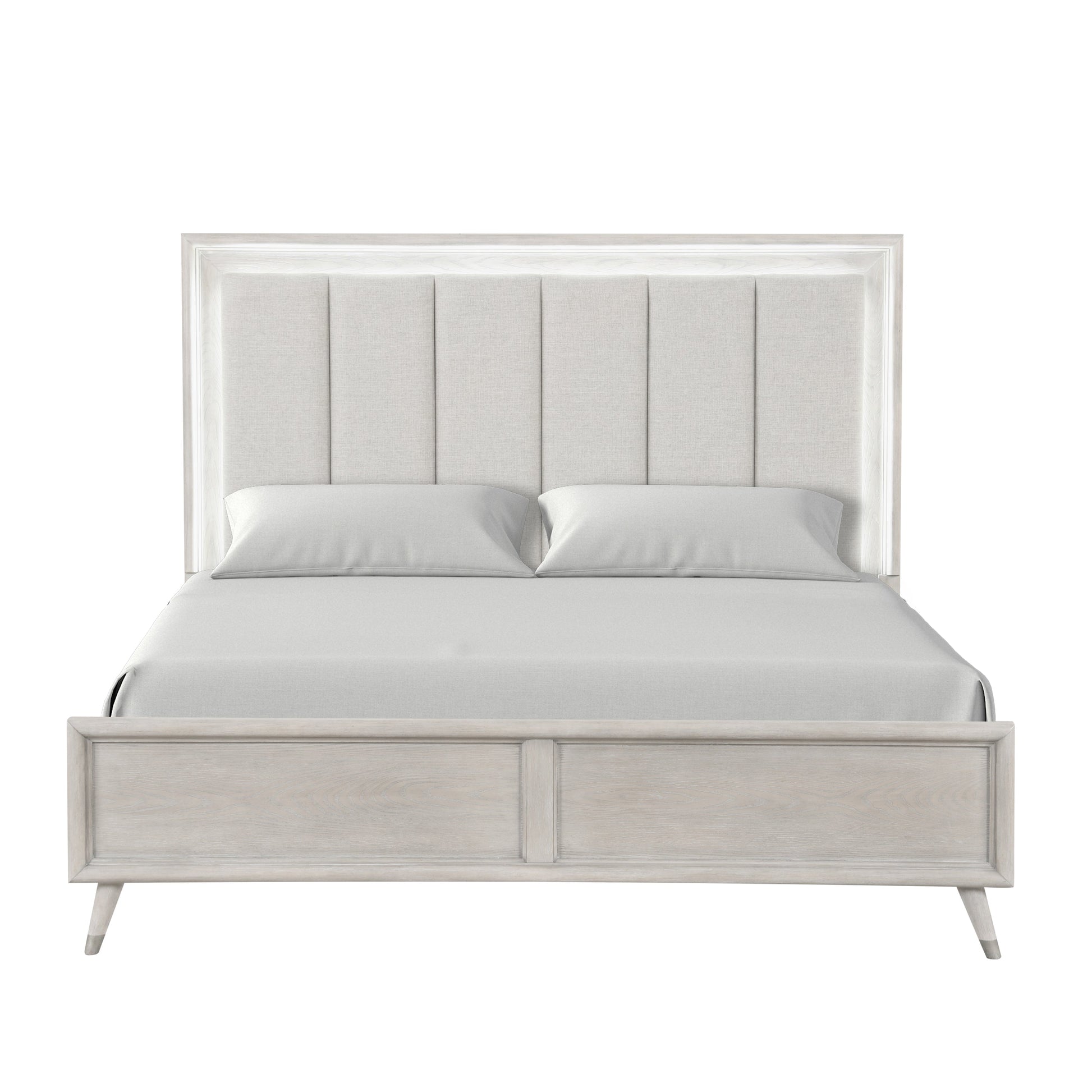 Meet the Seluna LED Lighting Panel Bed by Roundhill Furniture. Elevate your bedroom with this exquisite piece that combines functionality and style. Featuring an upholstered headboard that is wrapped in breathable fabric, it offers cloud-like comfort and understated elegance, with built-in lighting that illuminates your room with a soft, warm glow. Constructed with a pinewood frame and durable slats, it provides exceptional stability and durability. The wood grain textures and gray oak finish add a touch of sophistication, while the tapered feet with silver-finished caps provide both stability and a fresh look. This bed offers both modernity and a chic style. Available in two size options: Queen and King. A box spring is required.