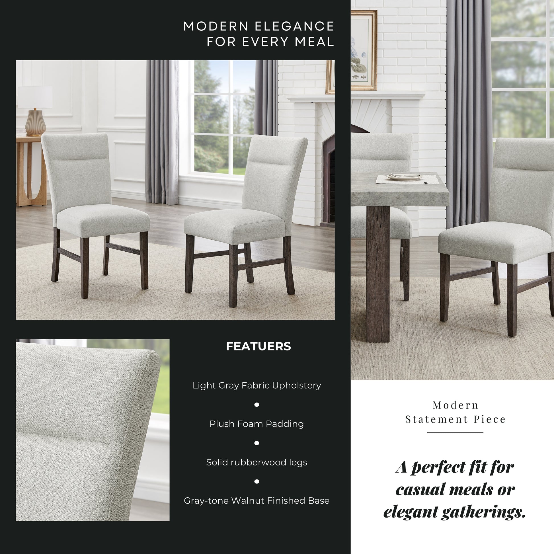 Enhance your dining space with this elegant and comfortable chair set, designed to blend modern style with everyday functionality. Upholstered in soft light gray fabric, these chairs offer plush foam padding for superior comfort, making every meal more enjoyable. The solid rubberwood legs ensure lasting durability, while the gray-tone walnut finish adds a refined, contemporary touch. Whether paired with a matching dining table or used as accent seating, this set of two provides a cohesive and stylish addition to any home.