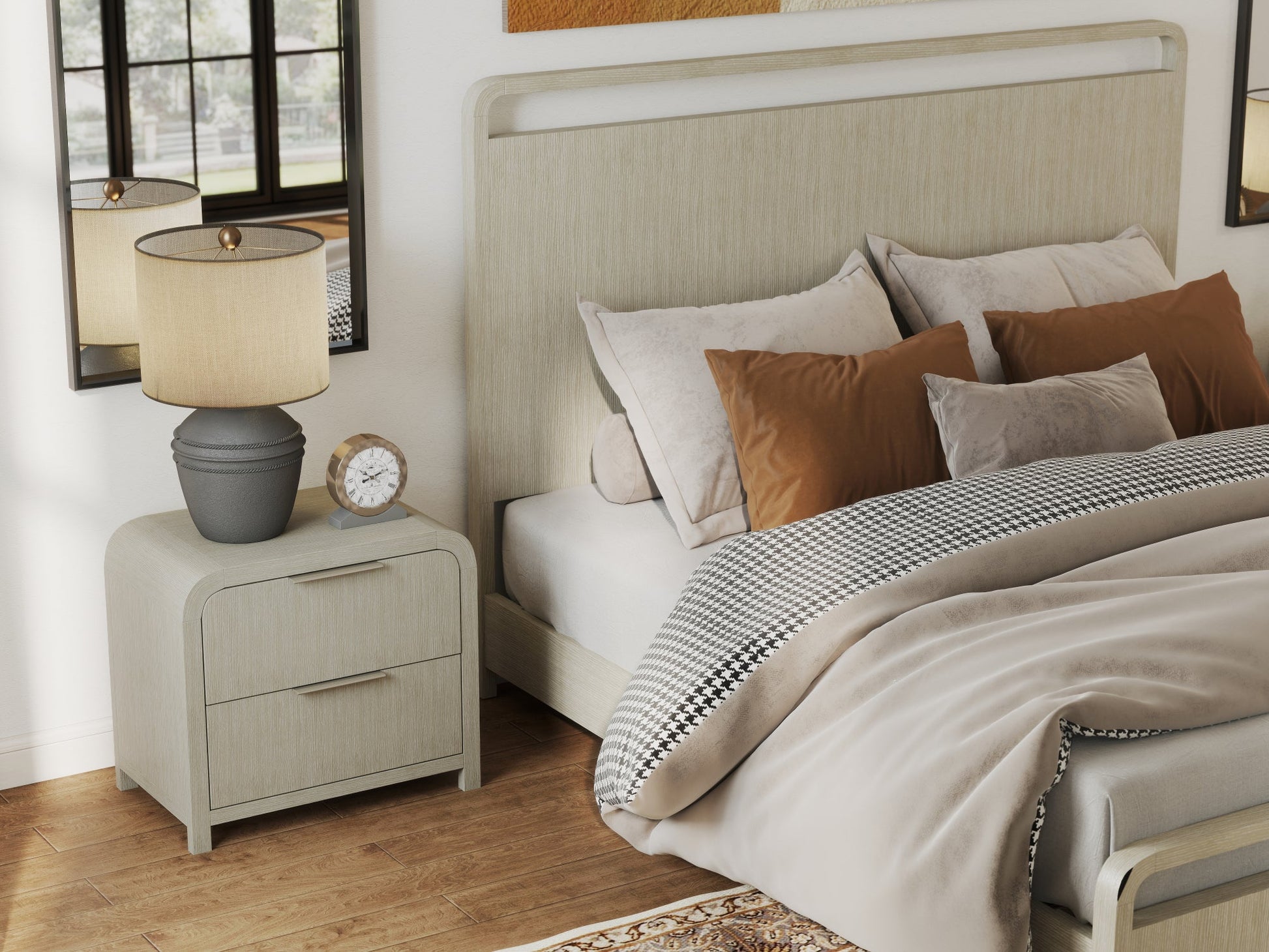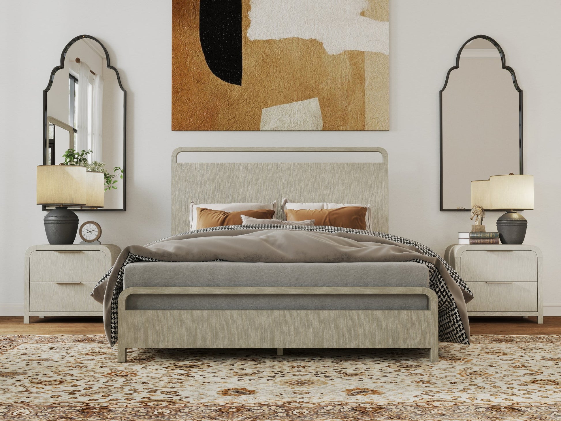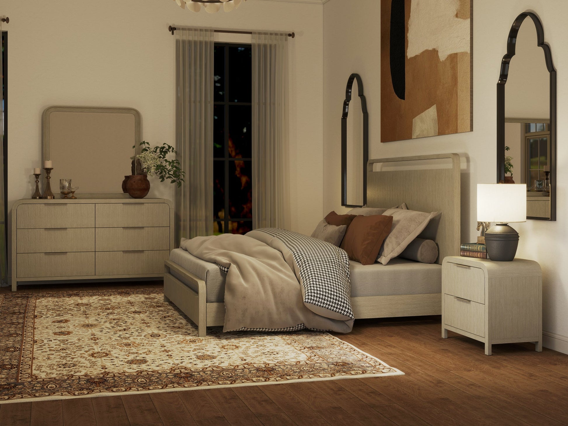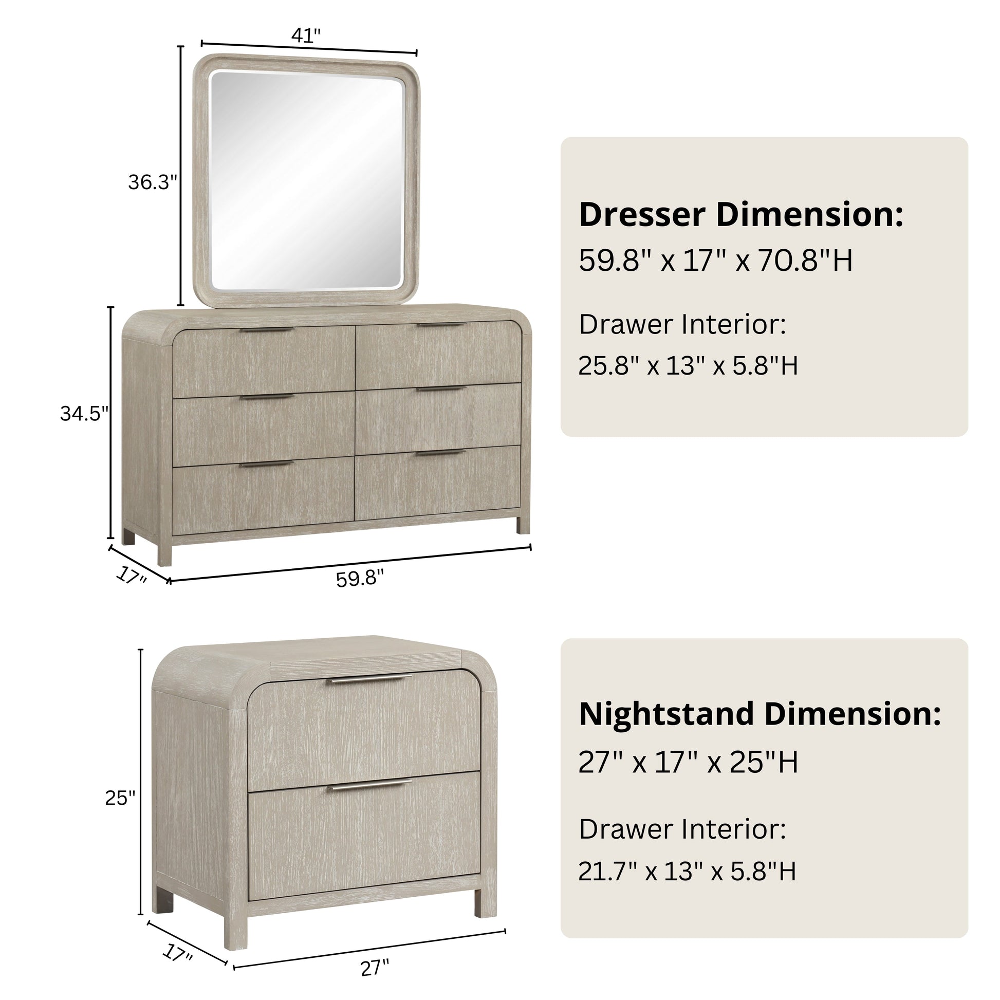 The light gray finish with wood grain texture adds a fresh, airy look, while rounded edges and sleek nickel-finished handles offer a refined touch. The panel bed's clean lines and sturdy wood construction ensure timeless appeal, while the dresser and nightstand offer generous storage with smooth-glide drawers and felt-lined top drawers to protect your essentials. A perfect balance of form and function, this set brings comfort, convenience, and style to any modern bedroom.