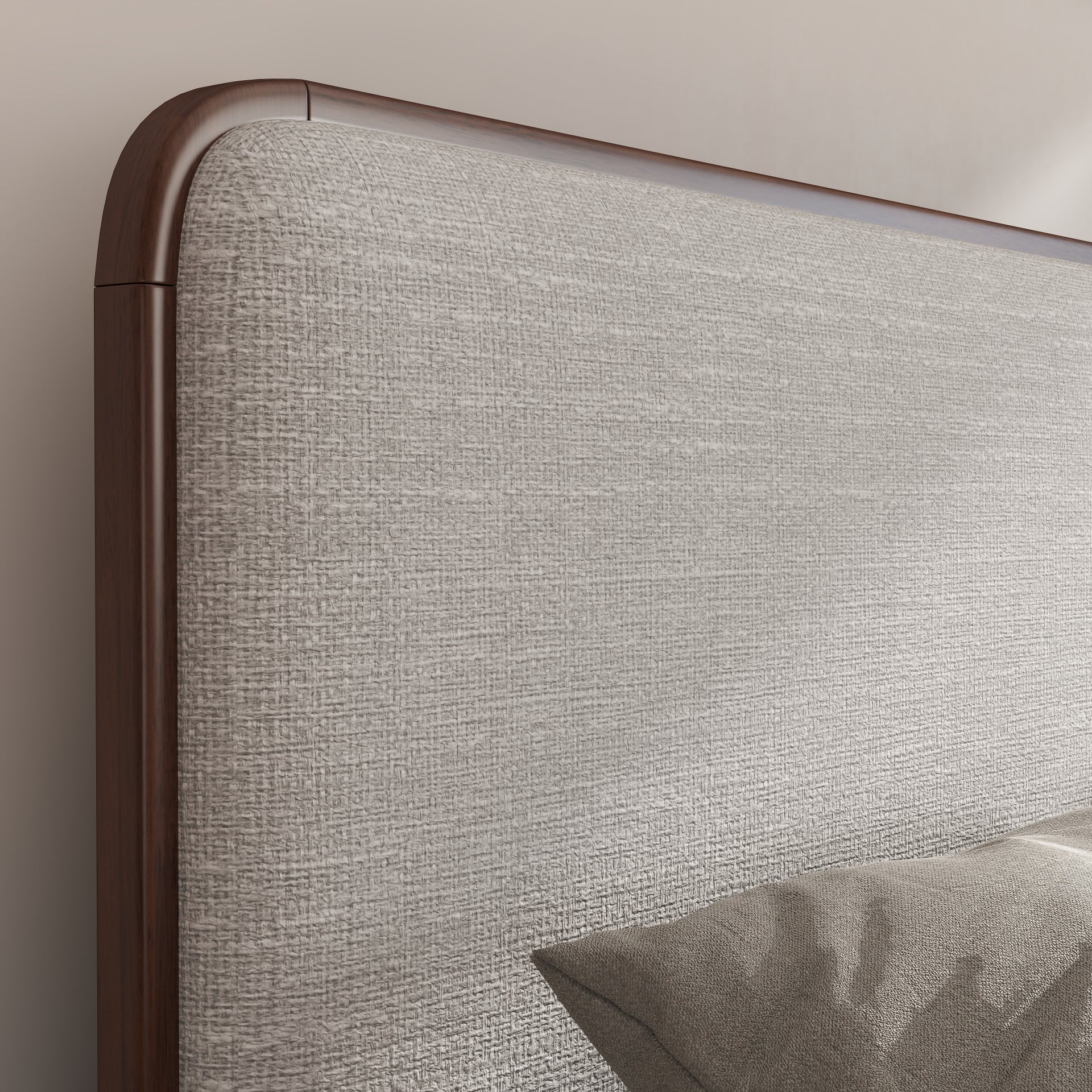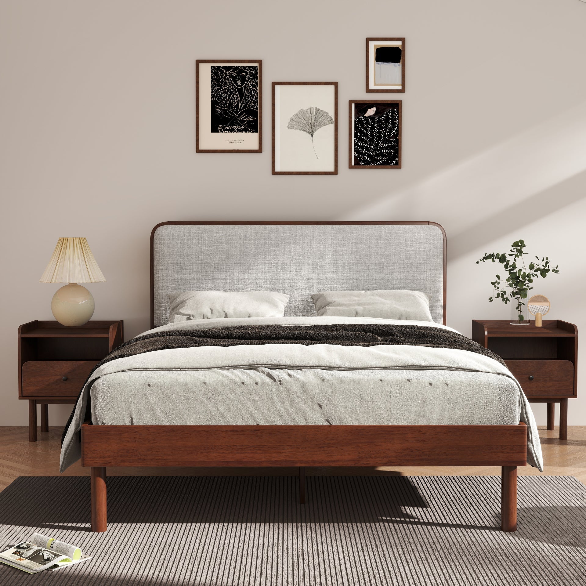 This Collection includes a bed and a nightstand. Its upholstered headboard is wrapped in breathable fabric, offering cloud-like comfort and understated elegance. With a rich natural walnut finish and tapered cylindrical legs, it creates an appealing and fresh look. Crafted from durable rubberwood, this bed ensures lasting durability. A matching nightstand completes the set, featuring a dual-tier design that offers versatile storage for your essentials. The nightstand is constructed from rubberwood and MDF in the same finish, making it a stylish and practical addition to your bedroom.