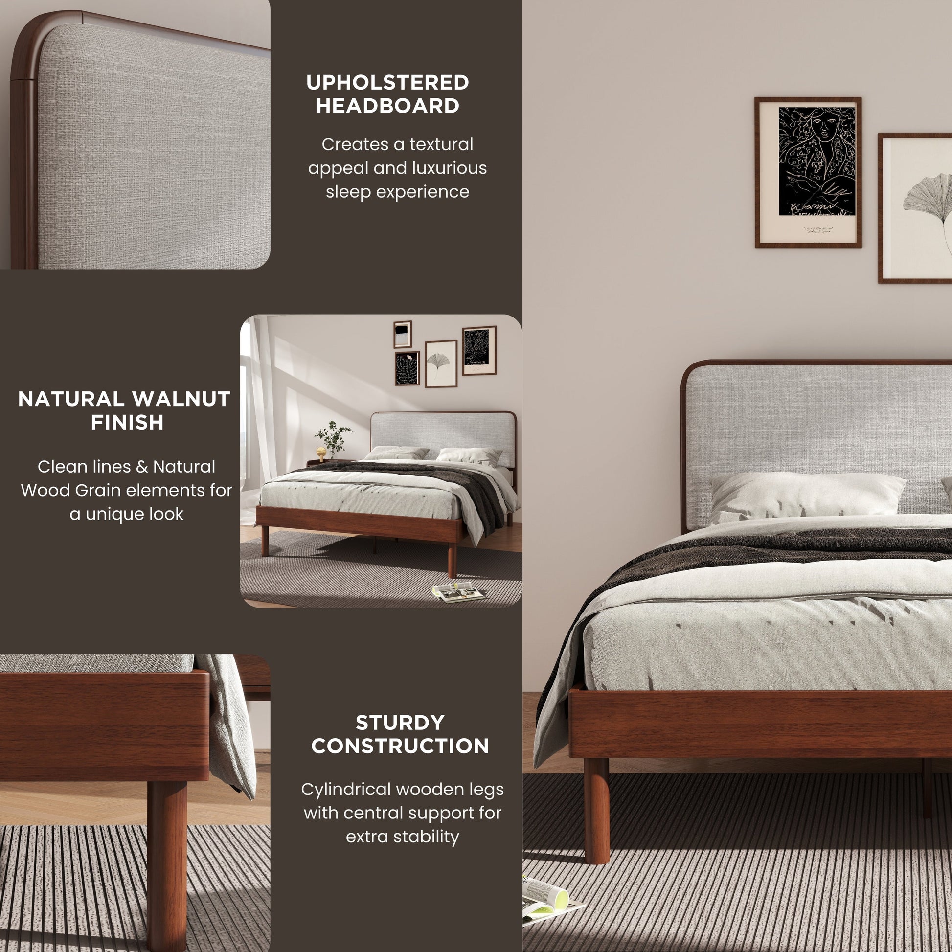 - [PLATFORM BED]: Expertly crafted, this long-lasting bed is made with a rubberwood frame, straight wooden slats, integrated rails, and support legs. The grayish-upholstered headboard is padded with breathable fabric for comfort. Finished in natural-walnut, it adds a simple yet elegant touch to your bedroom.