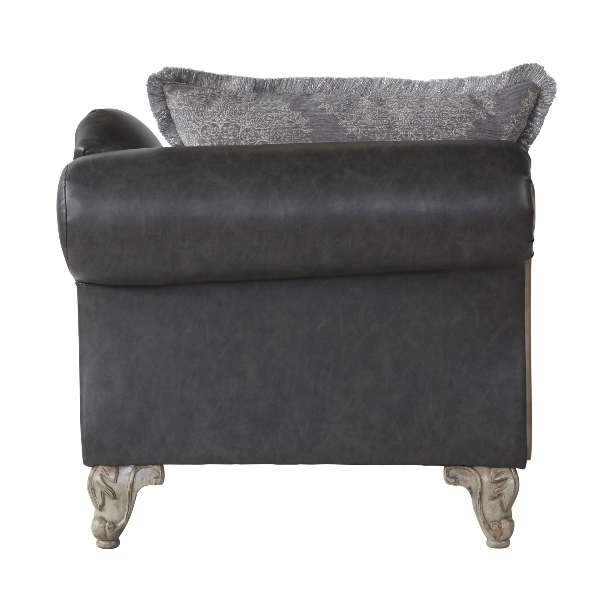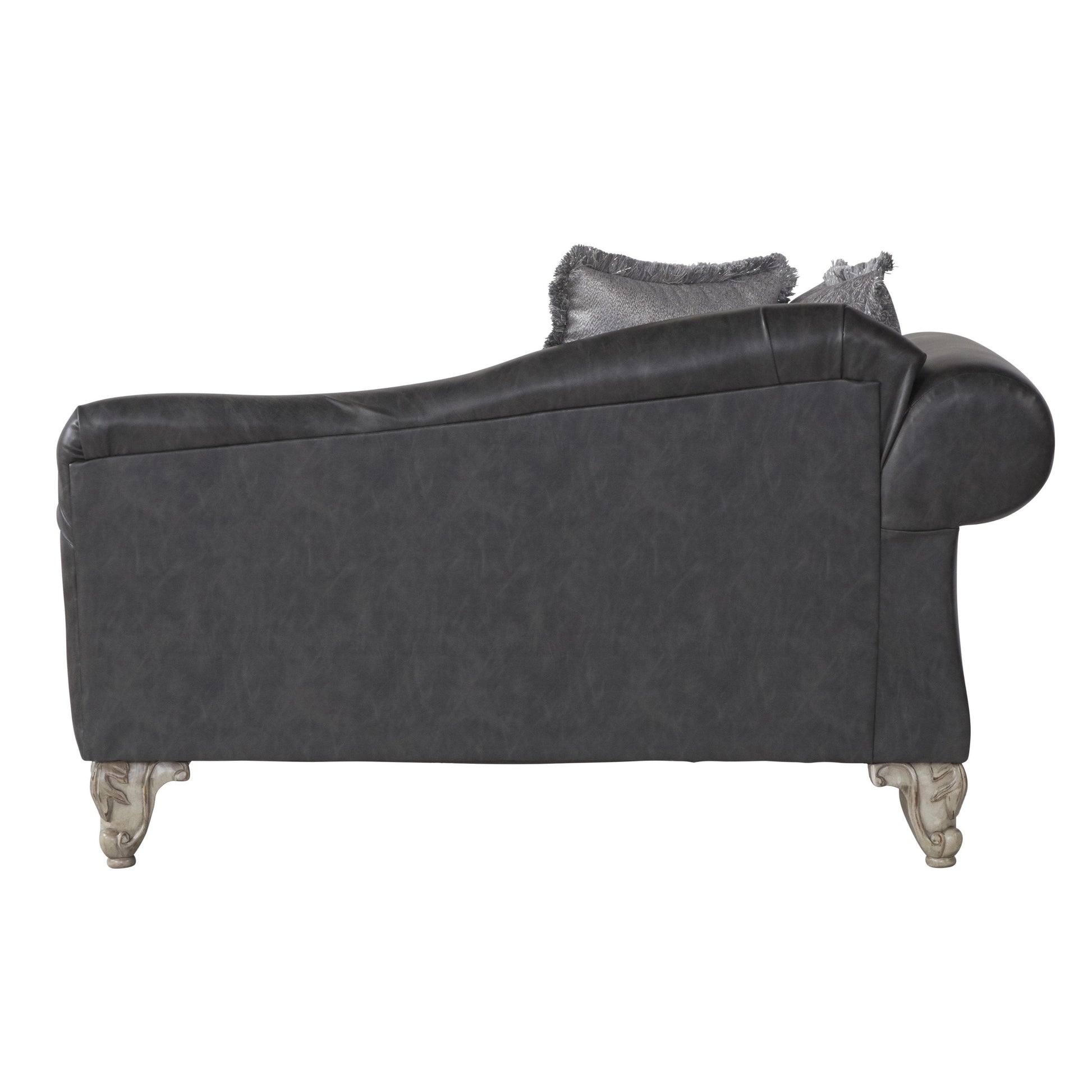The Classically styled pillow back San Marino Chaise is a beautiful combination of colors and fabrics that will bring warmth to any home. This sophisticated chaise is covered in a rich ebony bi-cast material and the cushions and seat pillows in a contrasting gray solid color fabric. The traditional details and carved wood face trim add elegance and grace to your living room.