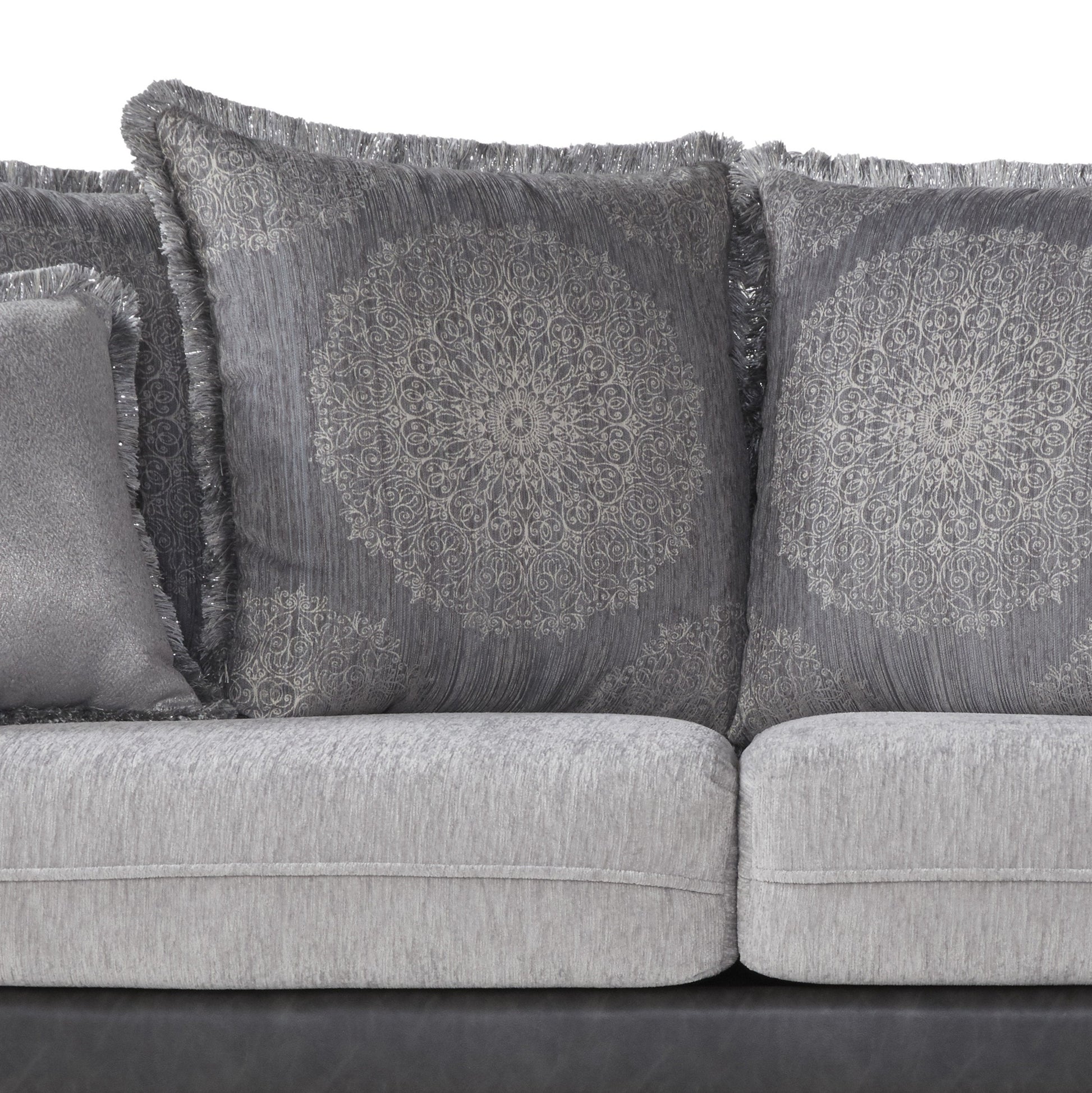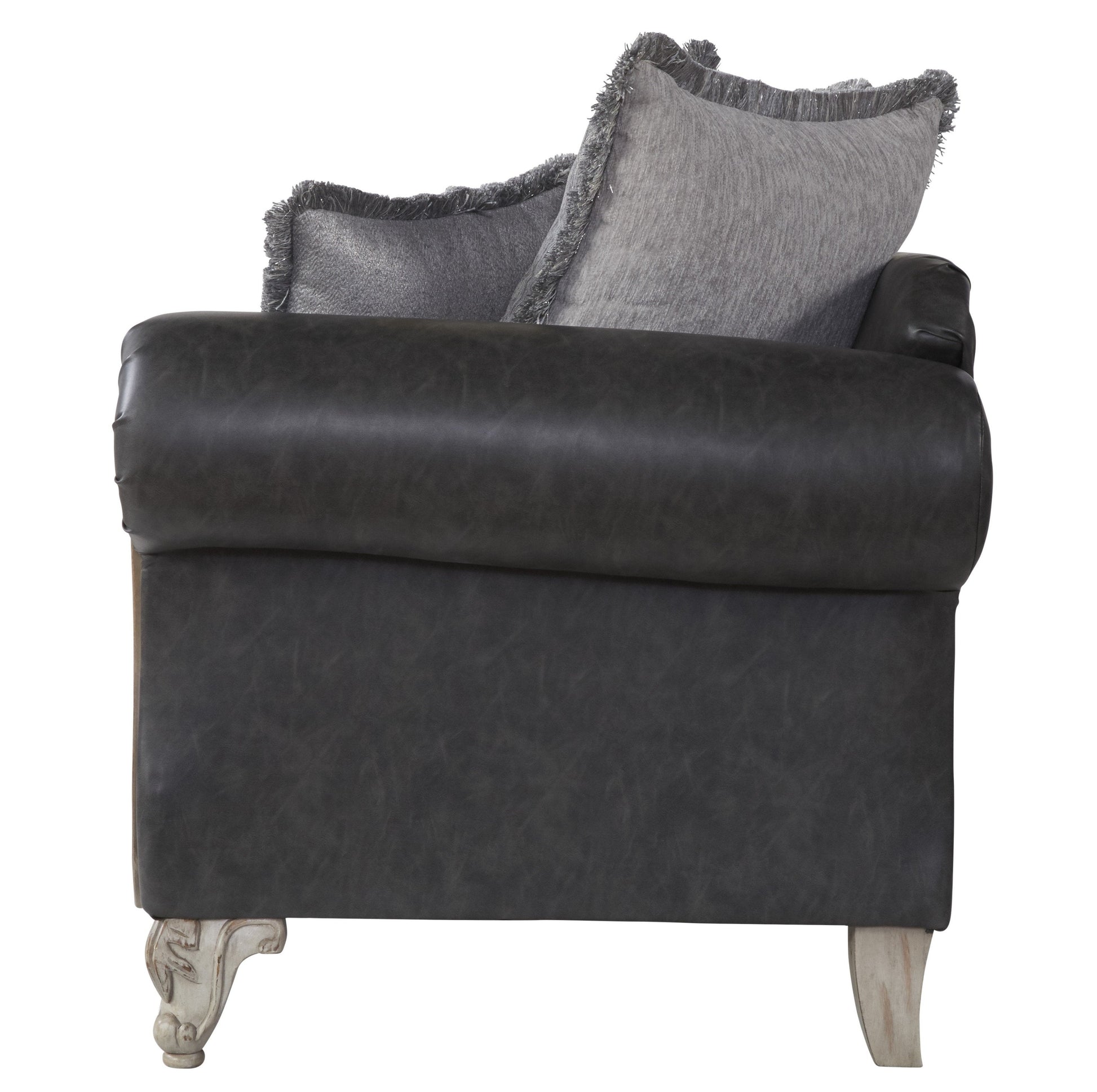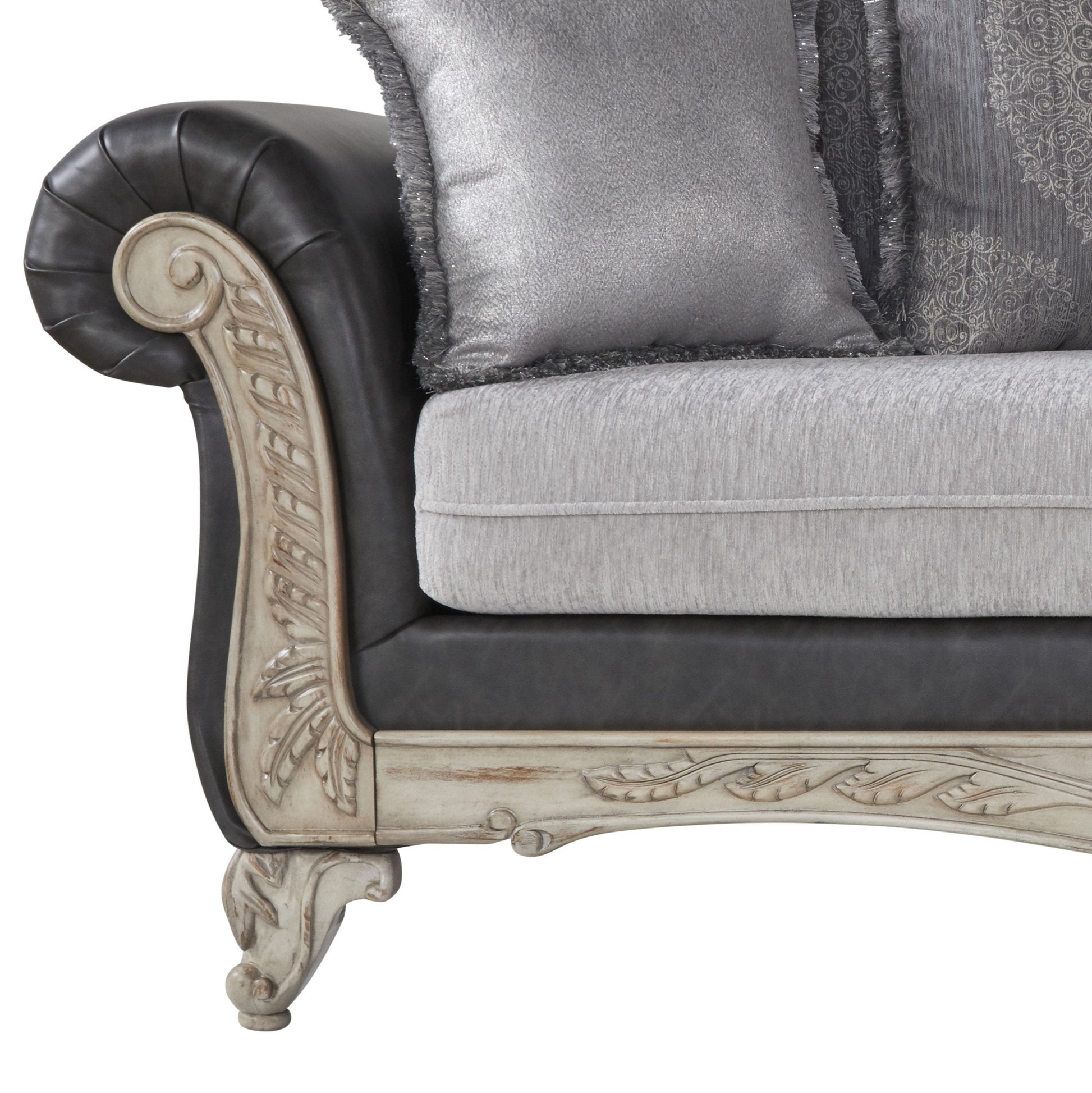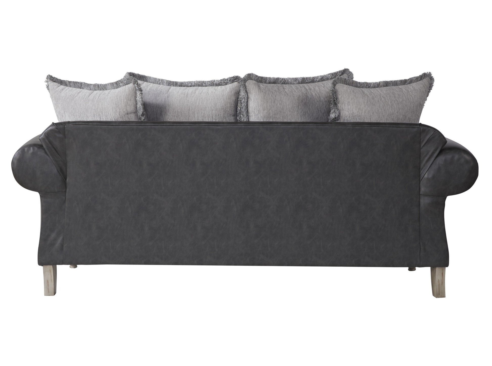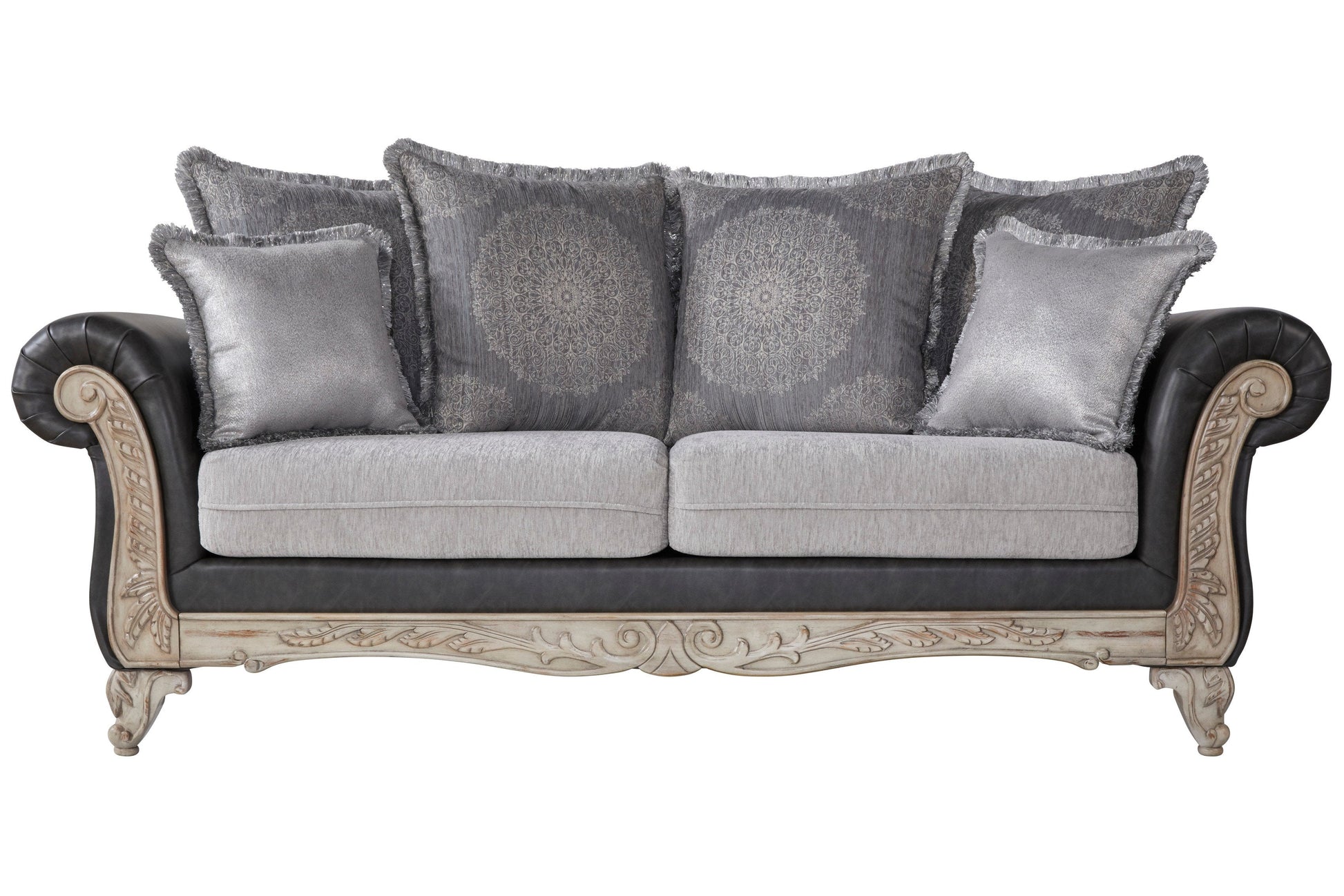 The Classically styled pillow back San Marino Sofa is a beautiful combination of colors and fabrics that will bring warmth to any home. This sophisticated sofa is covered in a rich ebony bi-cast material and the cushions and seat pillows in a contrasting gray solid color fabric. The traditional details and carved wood face trim add elegance and grace to your living room.