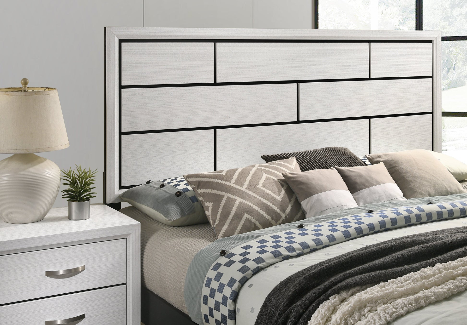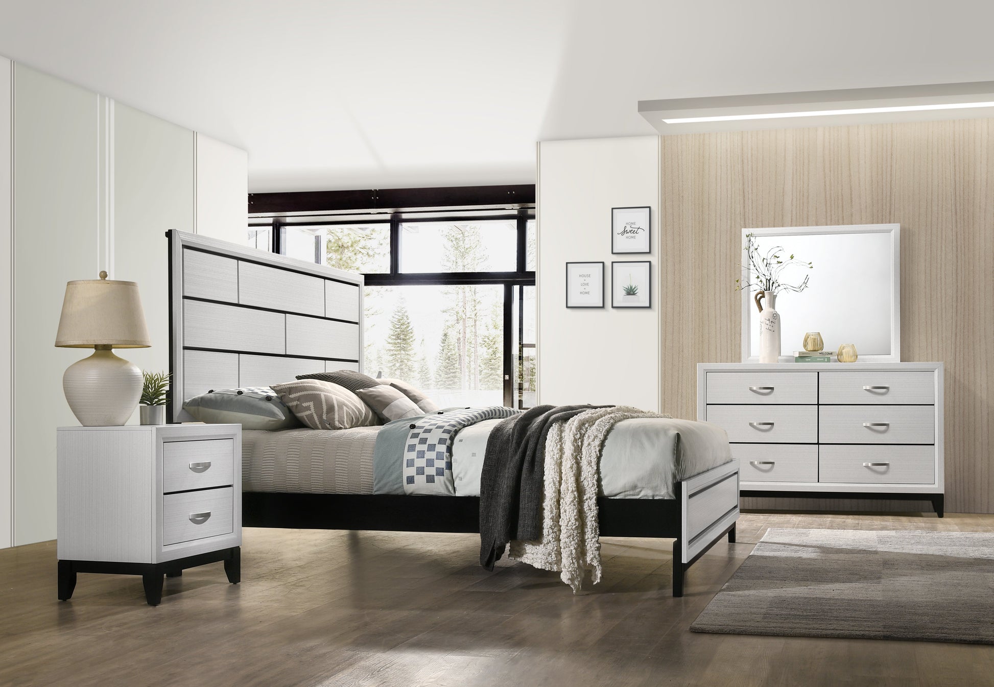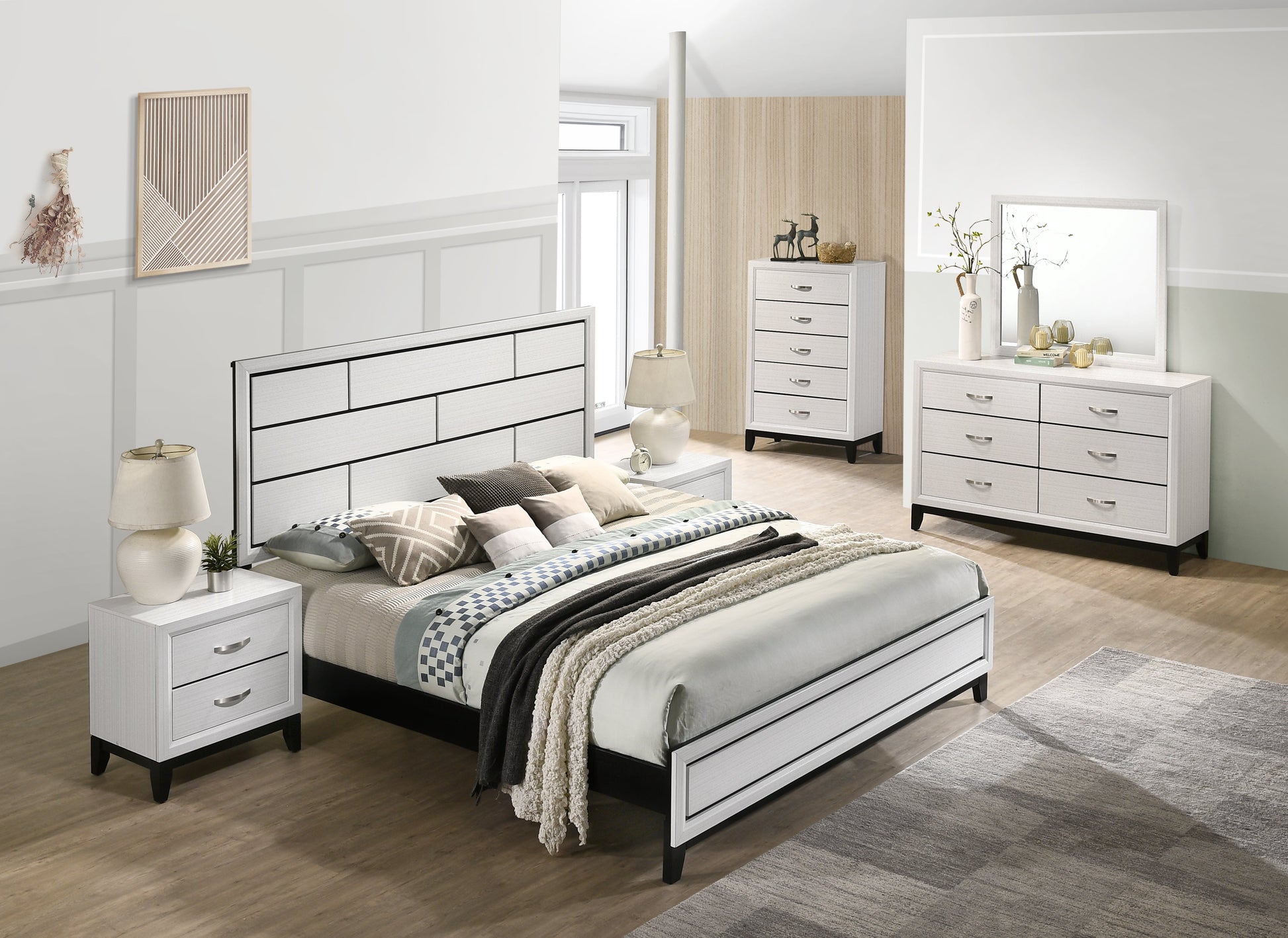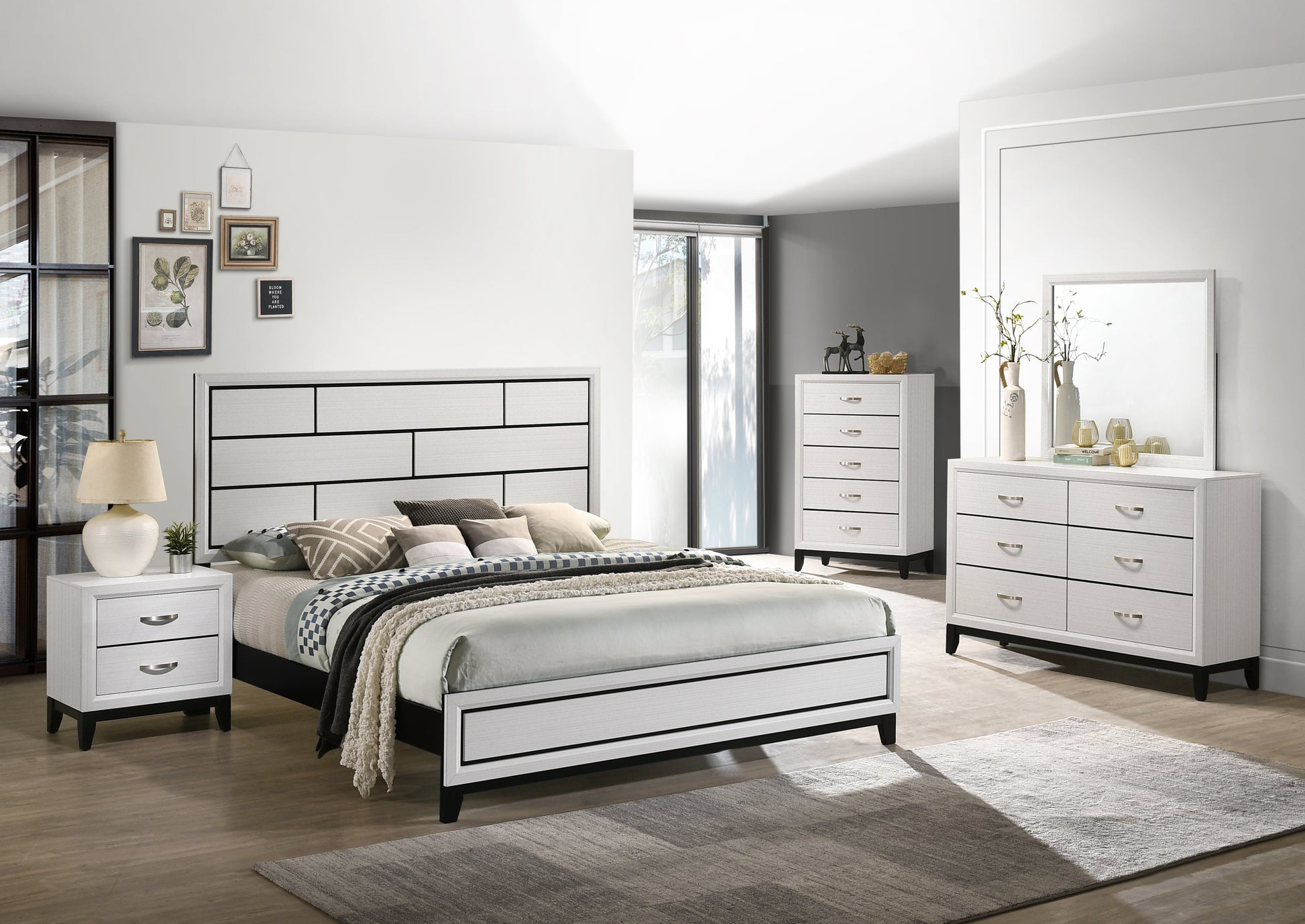 For a perfectly modern vibe, invite the Stout Contemporary Panel Bedroom Set into your bedroom. The simple panel bed is detailed by carved-in wood planks on its headboard and a low-profile footboard that stands on wood tapered legs. It is built of sturdy engineered wood and veneers in a chic, clean white finish. Drawers operate easily on metal guides and curved metal bar pulls in brushed nickel which lends a touch of simplicity. The Black finished base with the tapered feet adds a solid contrast with the white finish.
