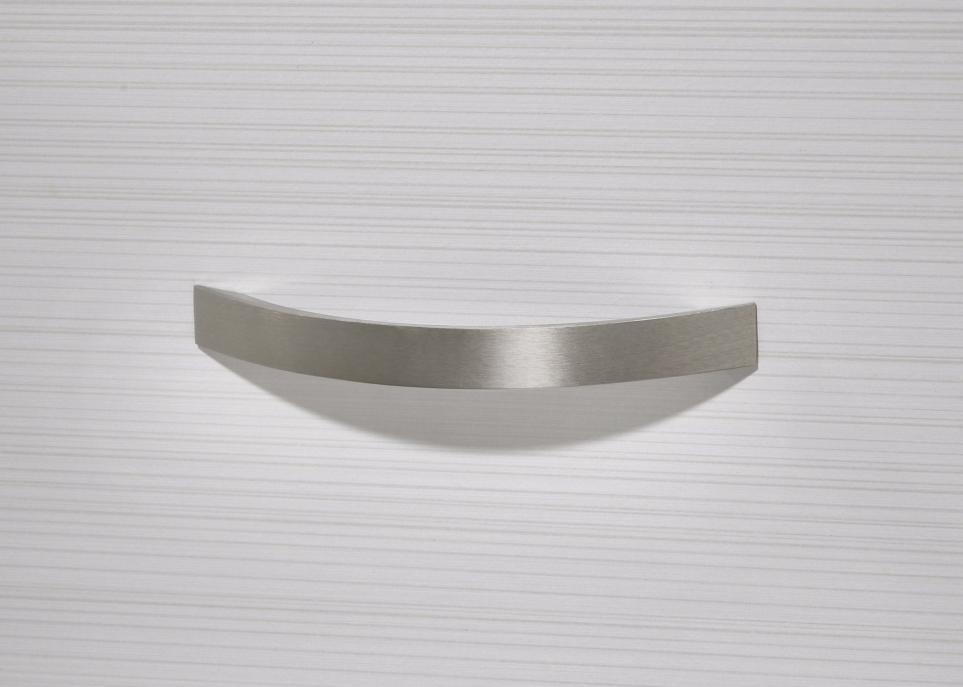 - Drawers operate easily on metal guides underneath and curved metal bar pulls in a brushed nickel finish