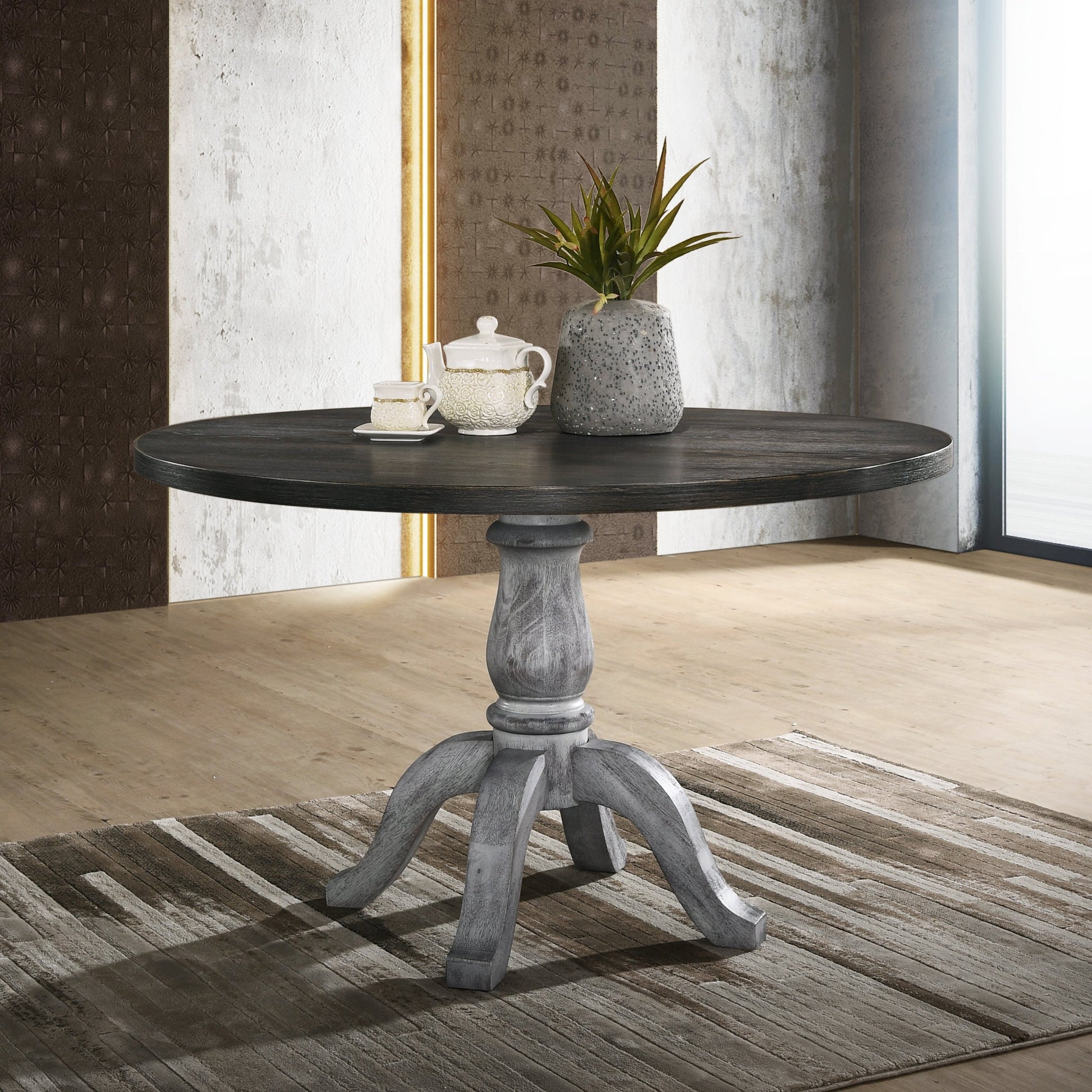 When it comes to your dining room ensemble, the table and chairs are the meat and potatoes. The Iris Dining collection, featuring round table and chairs, is made from solid rubber wood with weathered white and smooth woodgrain texture. The table has a central pedestal that allows for plenty of legroom, and strikes a stylish silhouette. The table top features a dark finish on solid rubber wood. The Iris Dining Set features a rustic style and it will be a great piece for your dining room. The piece also feature a solid rubber wood base.