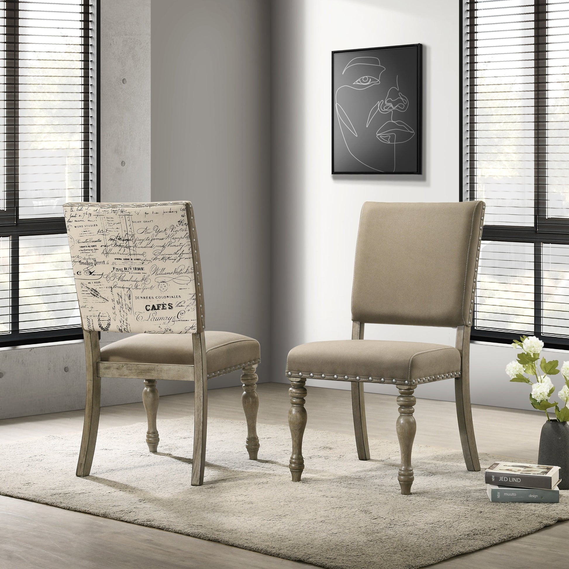 - Comfortable Seating ?€? Chairs feature tan microfiber upholstery, foam padding, and nailhead trim for a refined touch.