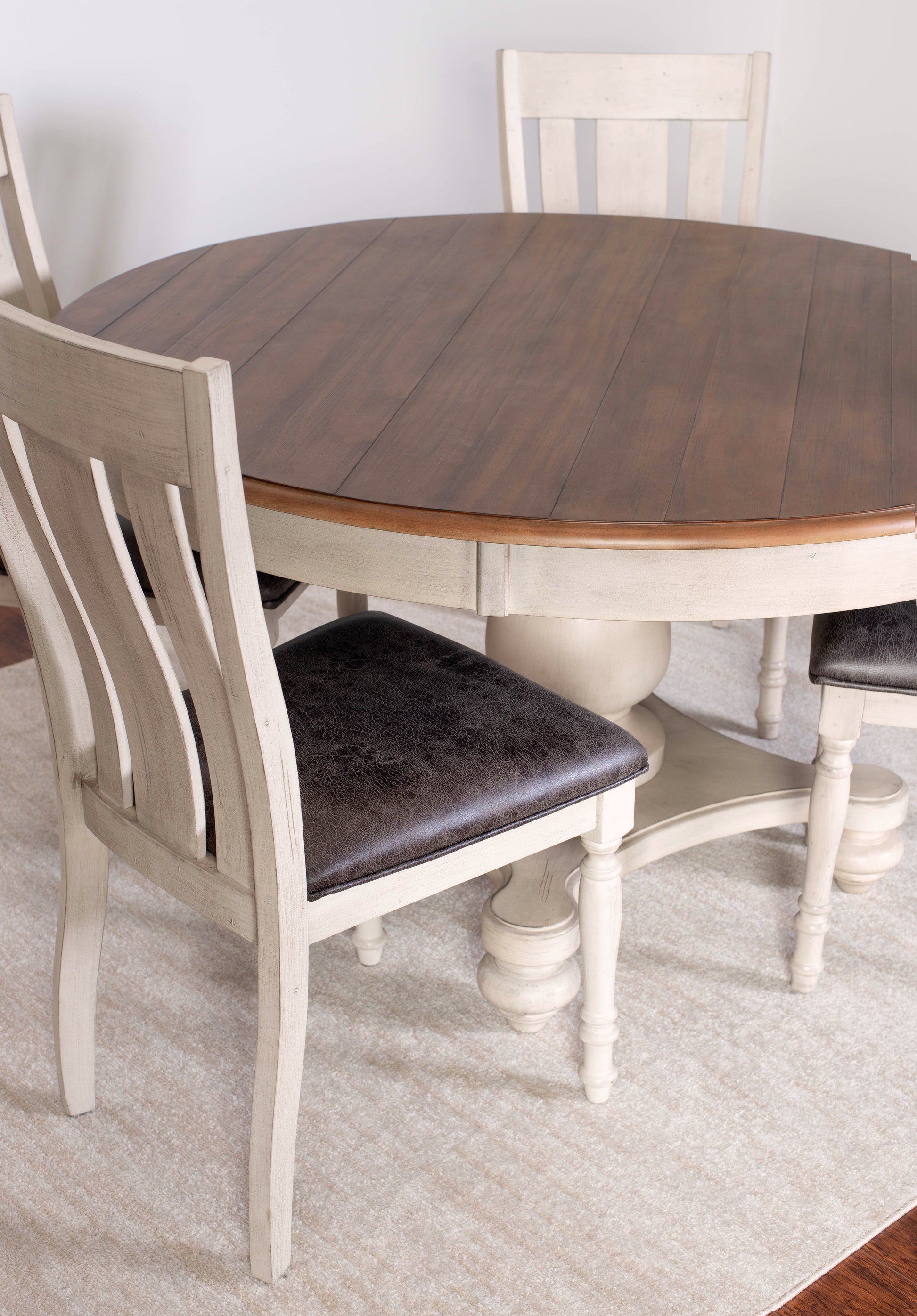 The Arch Dining Set - Weathered White & Oak helps you create a comfortable'stylish dining area for all your casual get-togethers, elaborate holiday dinners, and more. Constructed of hardwood solids, engineered wood, and veneers, this dining set includes a round table and matching chairs. With its warm, traditional style, it's perfect for family meals, dinner parties, and holiday gatherings. That's plenty of room for guests to sit and dine comfortably. The tabletop features a multi-step distressed finish, which offers a stylish contrast to the rubbed white finish on the rest of the table. Included are matching chairs with a stylish triple back panel design. The solid wood turned legs feature a weathered white finish and carved detail for an elegant touch. The seat, which has plentiful cushion, is contoured for your comfort. This set includes a table and four chairs.