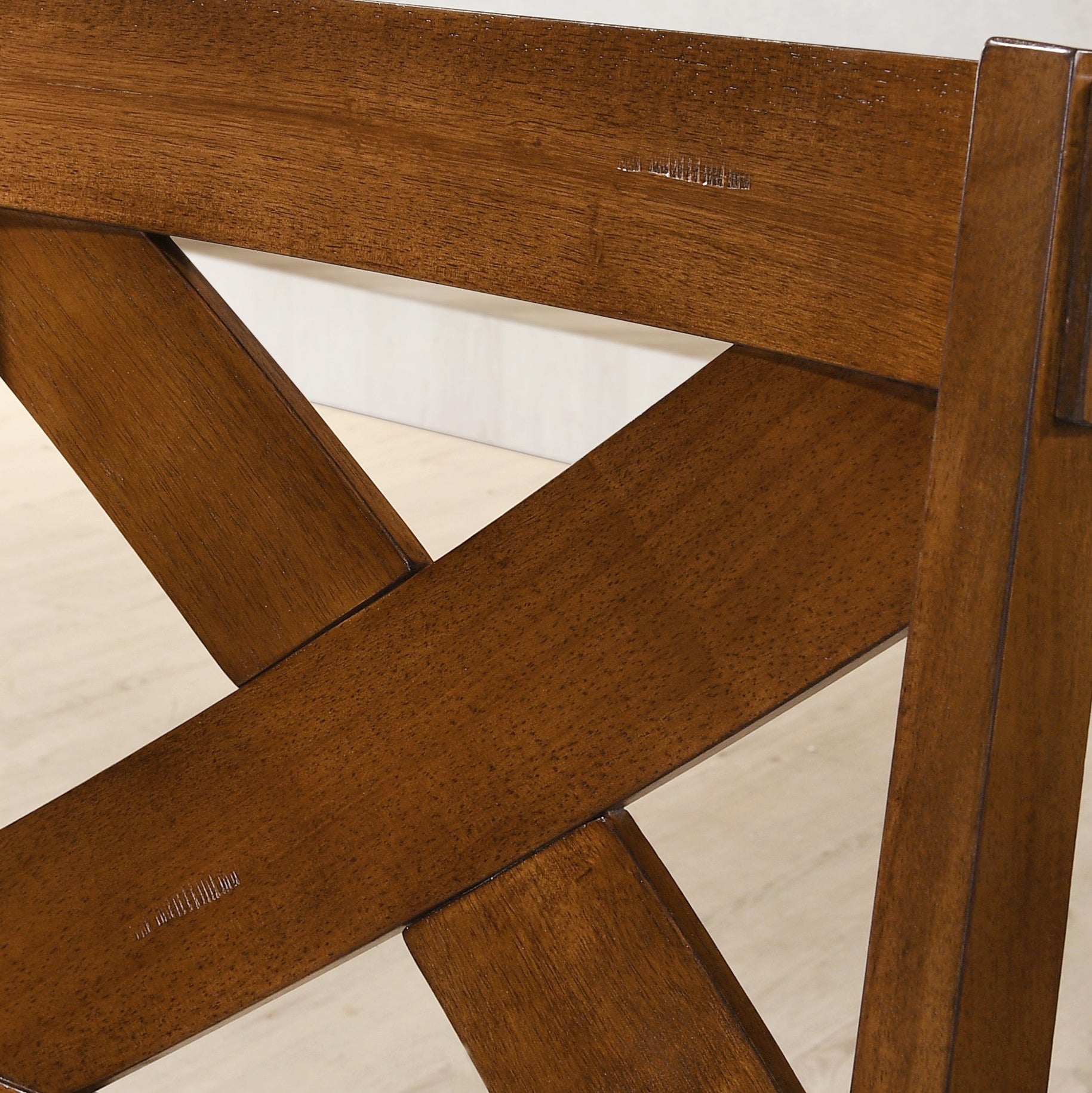 - This set includes a table and four chairs. Trestle base wood dining table finished in dark hazelnut, the chairs feature cross-back design with tan colored fabric upholstery