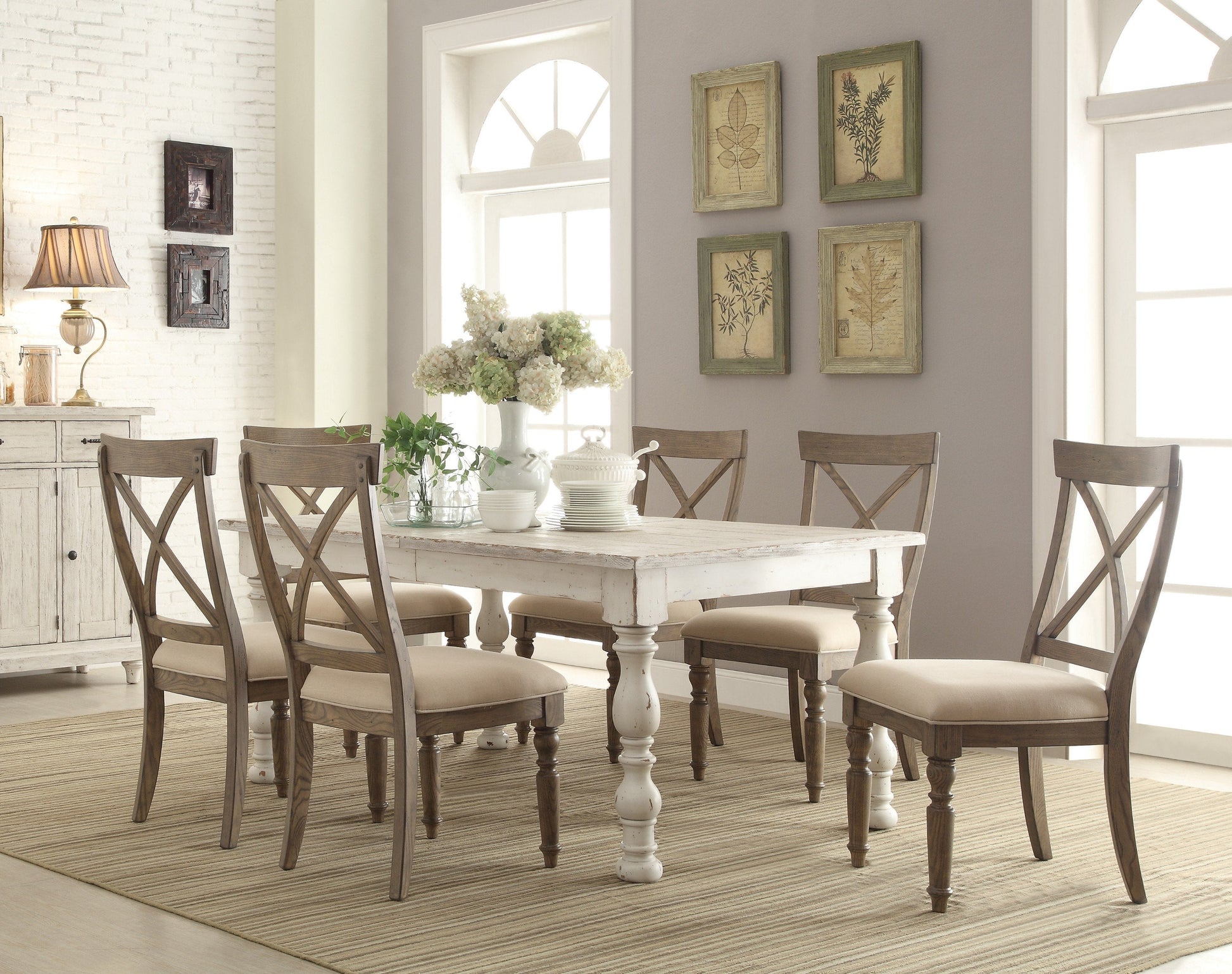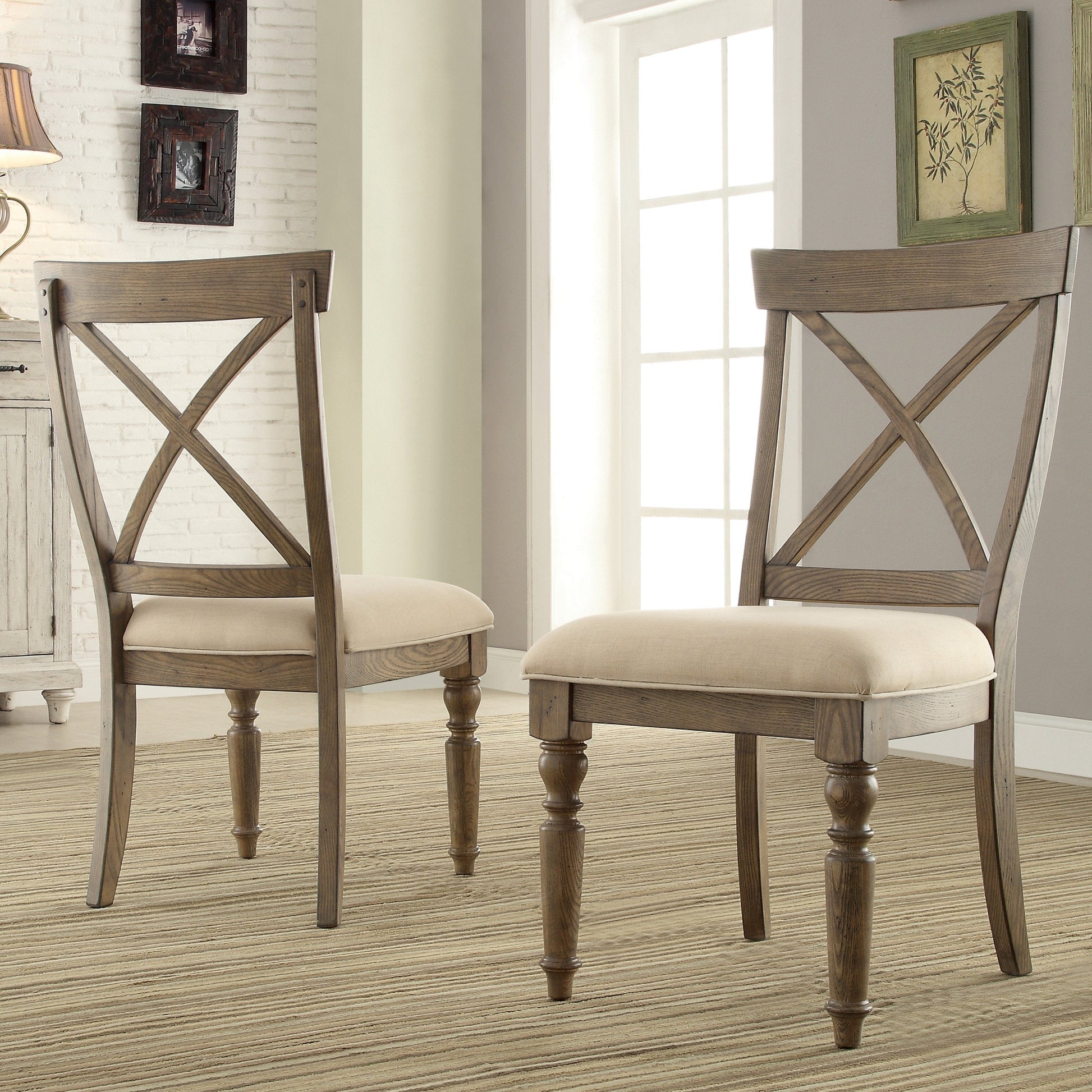 Find comfort and a homey feel with the Trani Weathered Driftwood Finish Cross Back Dining Chairs. This dining chair set has a weathered driftwood finish to give it that full farmhouse-style design. Soft and comfortable, the cream upholstered seats beautifully accent the color of the frame. Bring your family closer together by pulling up your cross-back dining chairs to the dinner table and enjoying each other's company.??