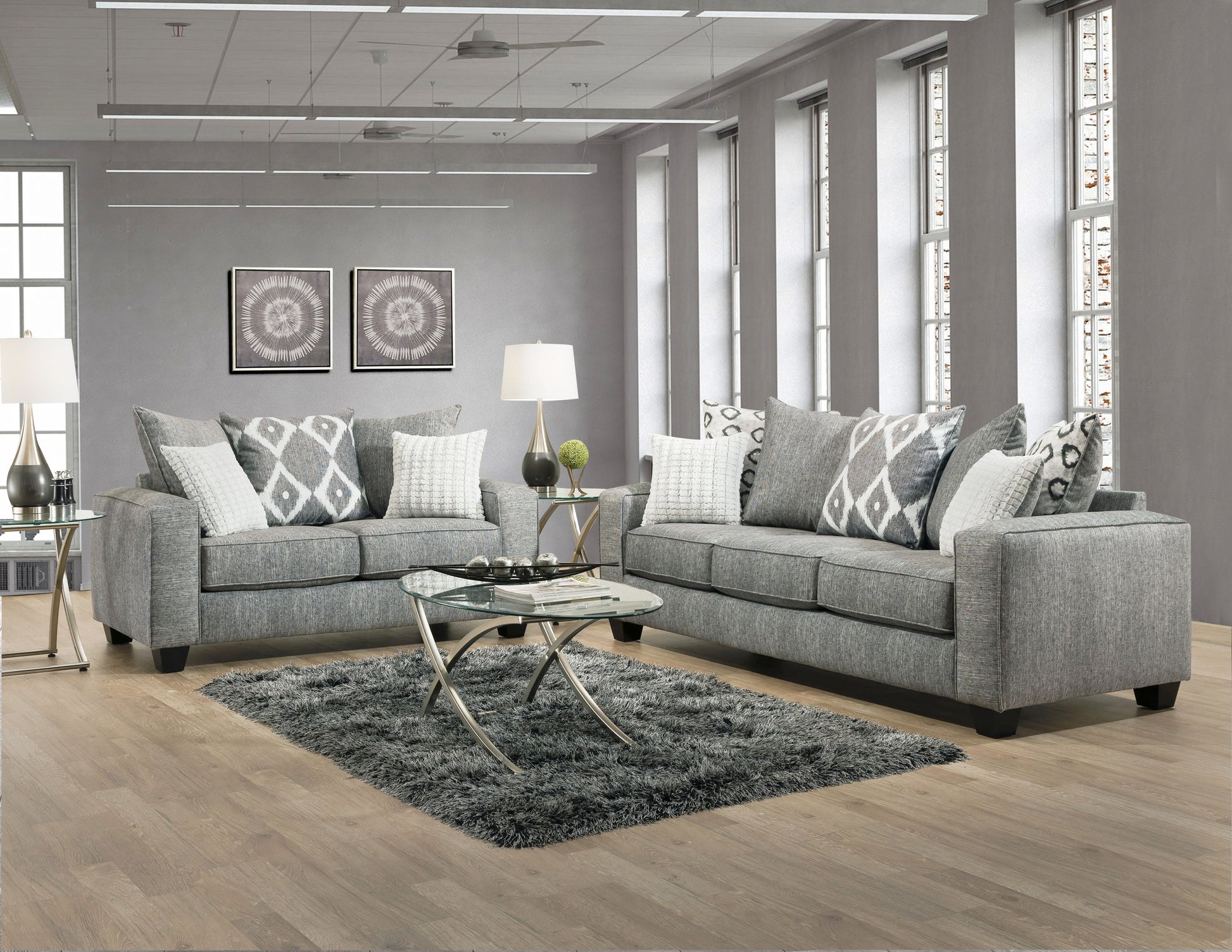 - The collection includes sofa and loveseat in a weathered medium-gray