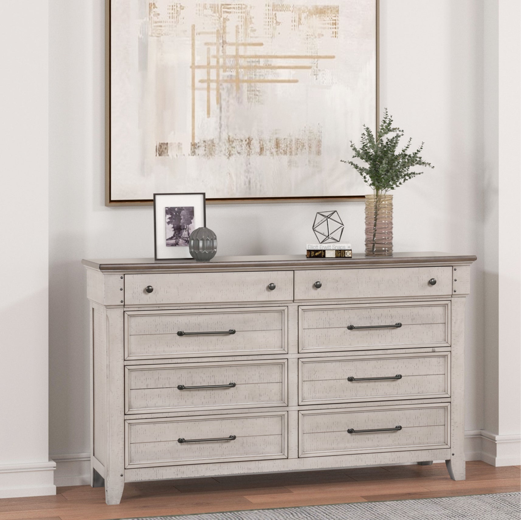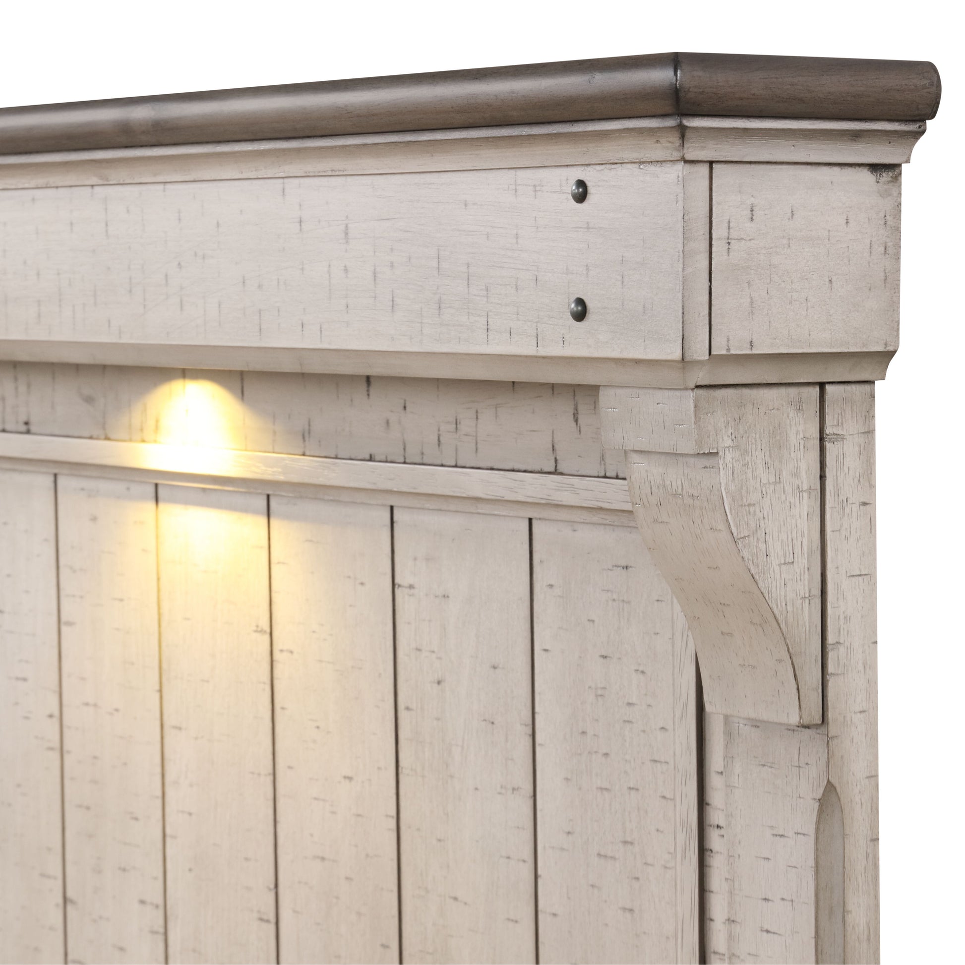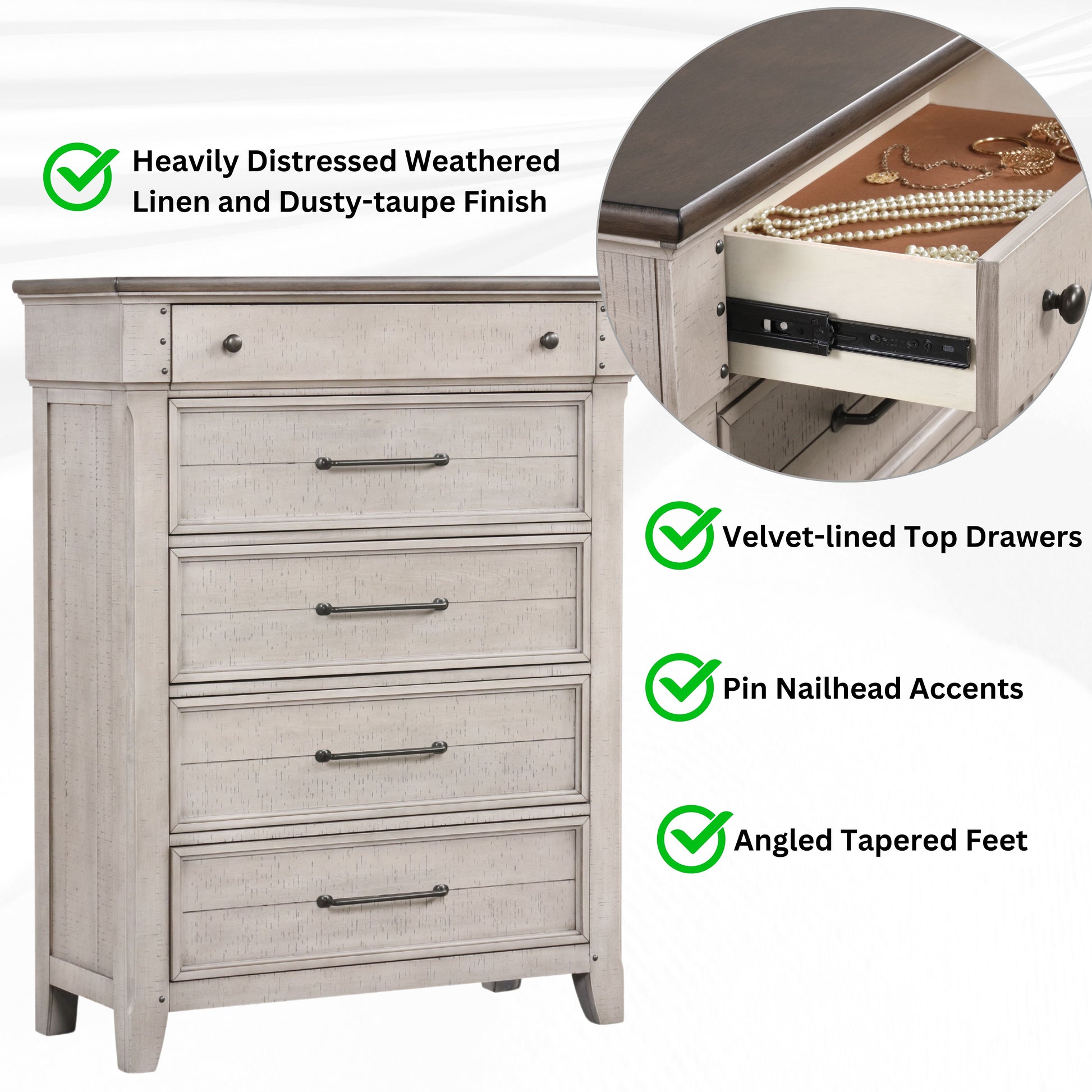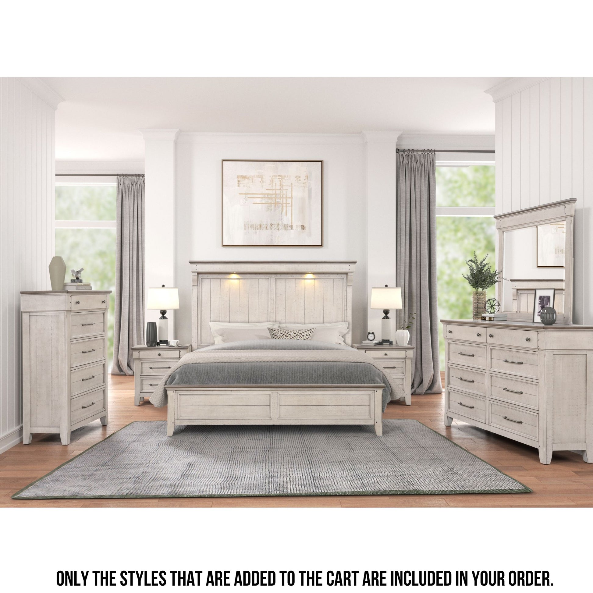 This collection includes a panel bed, 8-drawer dresser, mirror, 3-drawer nightstand, and 5-drawer chest. The headboard has built-in lighting that softly illuminates the room. Constructed with a Ruberwood frame, this set offers reliable support and longevity. The heavily distressed weathered dusty taupe finish adds a touch of sophistication, while the saw marks create an appealing farmhouse look. The top drawers are lined with felt velvet. Nightstand features a built-in charging station. Complete with pin nail head accents, this set offers both modernity and chic.