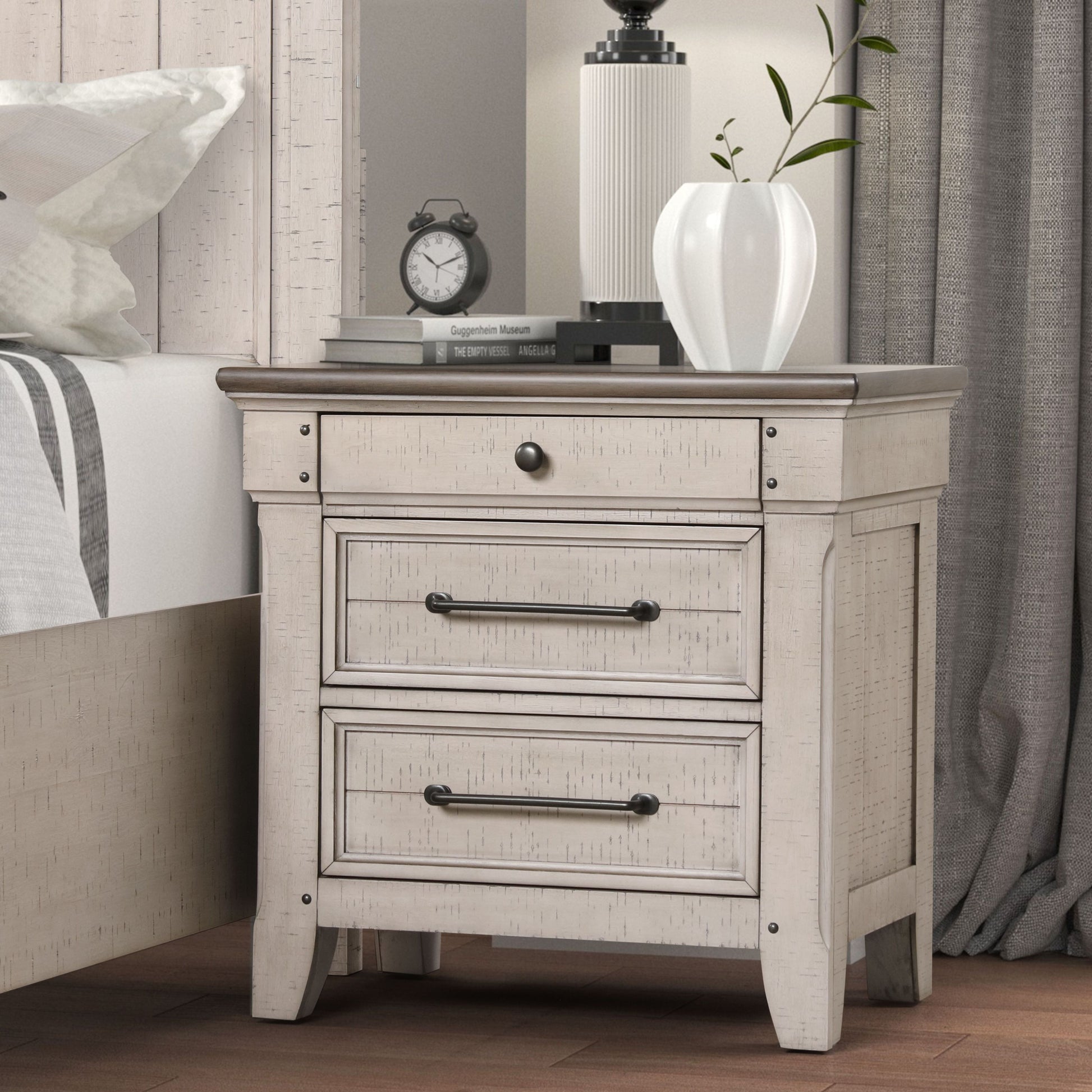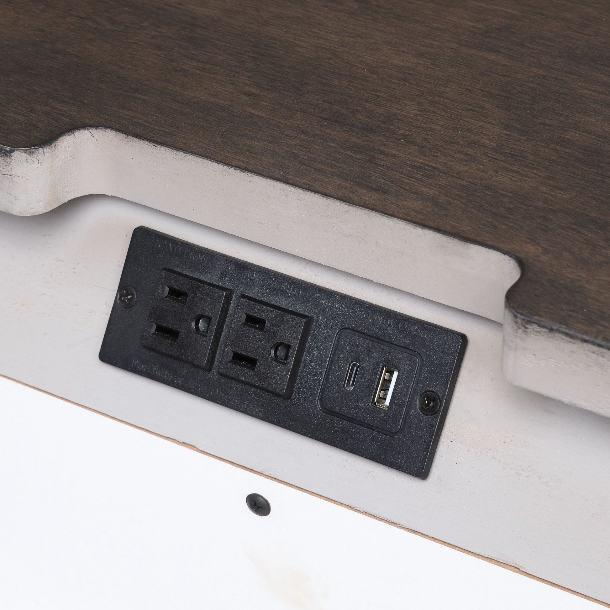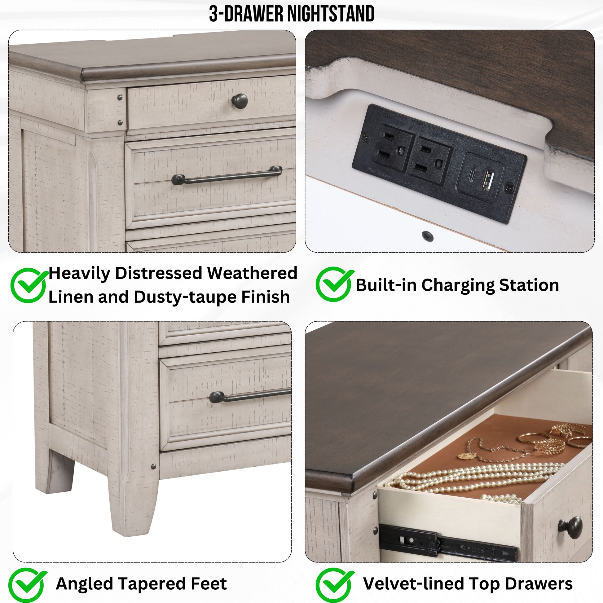 - [UNIQUE DESIGN]: This collection features a lighting panel bed in a heavily distressed weathered linen and dusty taupe finish with saw marks. Antique pewter handles and pin nail head accents add a touch of flair, while angled tapered feet provide stability. The nightstand also includes a built-in charging station with 2 outlets and 2 USB ports (Type AC) for your convenience.