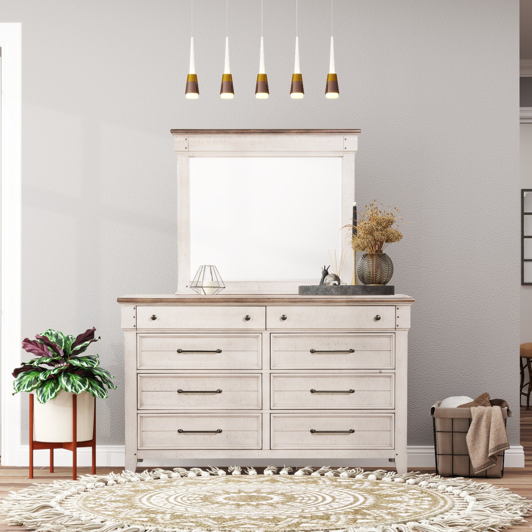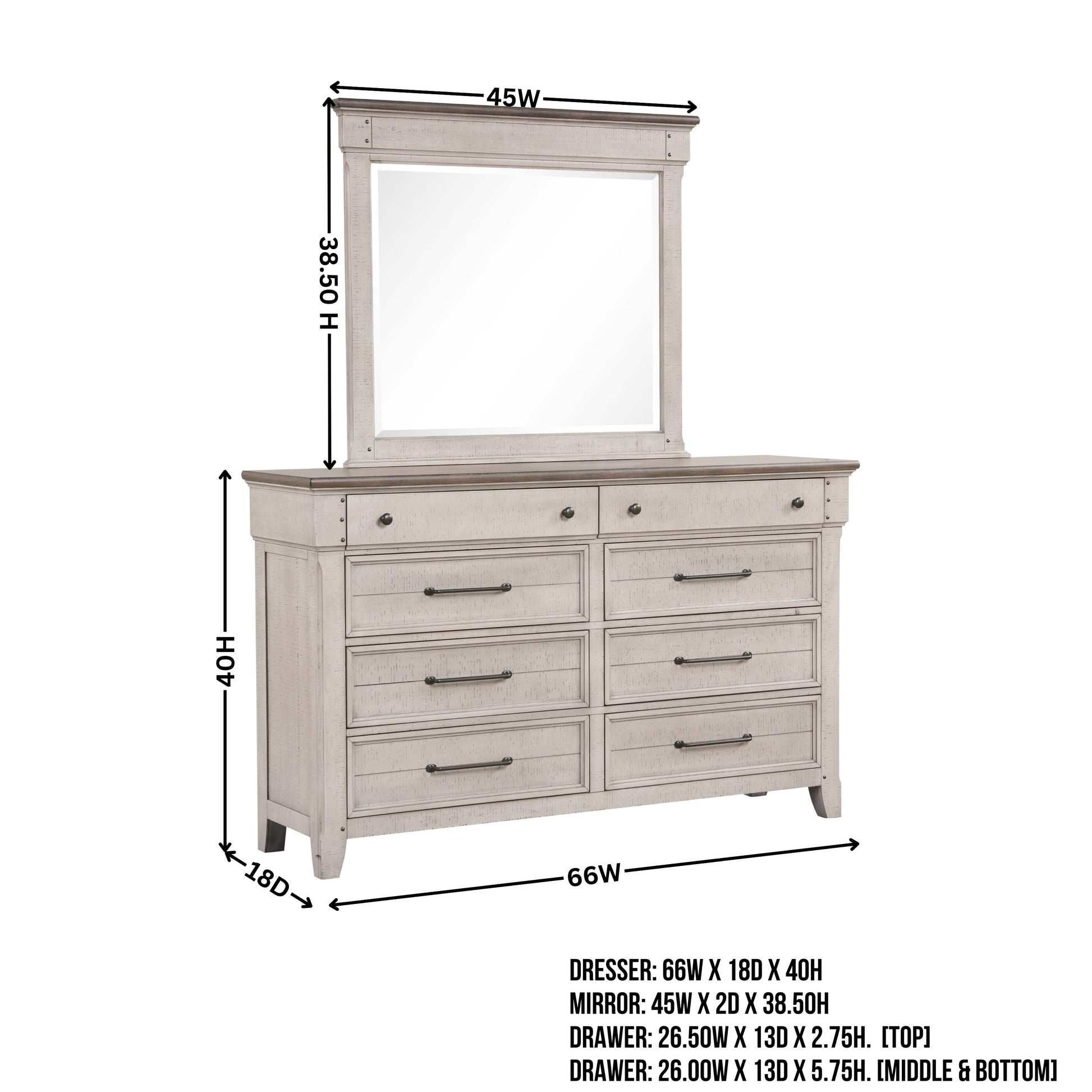 - [WALCOTT BEDROOM COLLECTION]: This Collection including panel bed, 8-drawer Dresser, Mirror, 3-drawer Nightstand, and 5-drawer Chest. No box spring needed.