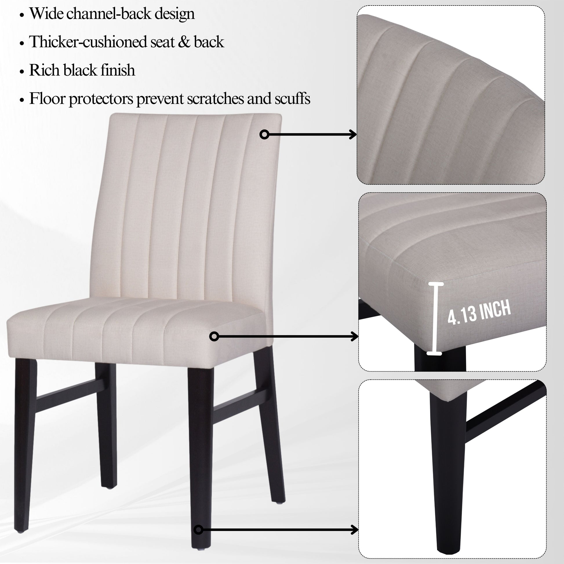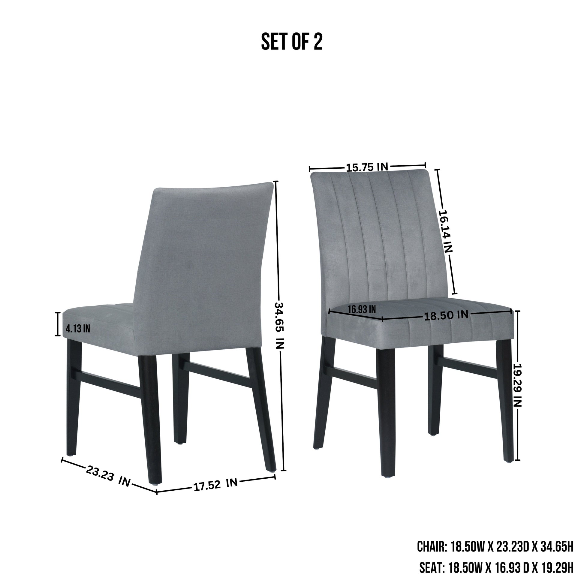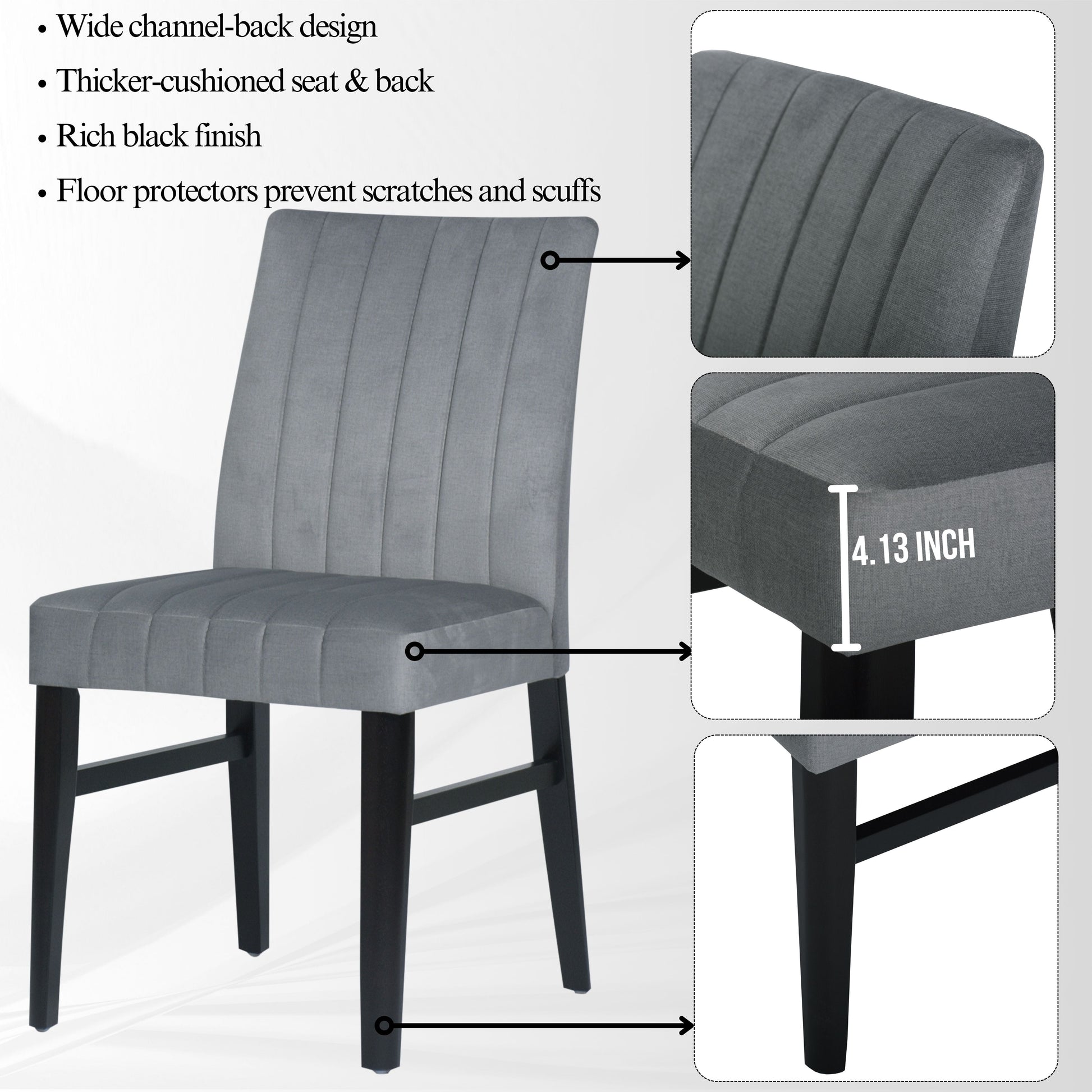 Meet the Roundhill Furniture Wendell Contemporary Upholstered Dining Chairs - a set of two chairs that perfectly blend luxury, comfort and durability. These meticulously crafted chairs are a visual treat that adds a striking touch to any room. The channel tufted design with a sleek rich-black finish effortlessly enhances the décor of your dining area. The chair features a seat and back that are overfilled with premium fabric for long-lasting comfort. The Rubberwood legs offers uncompromising stability, while built-in floor protectors keep your floors scratch-free.